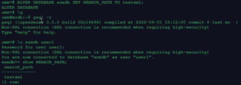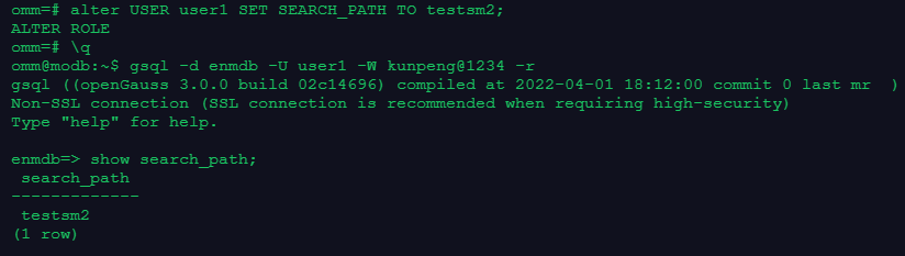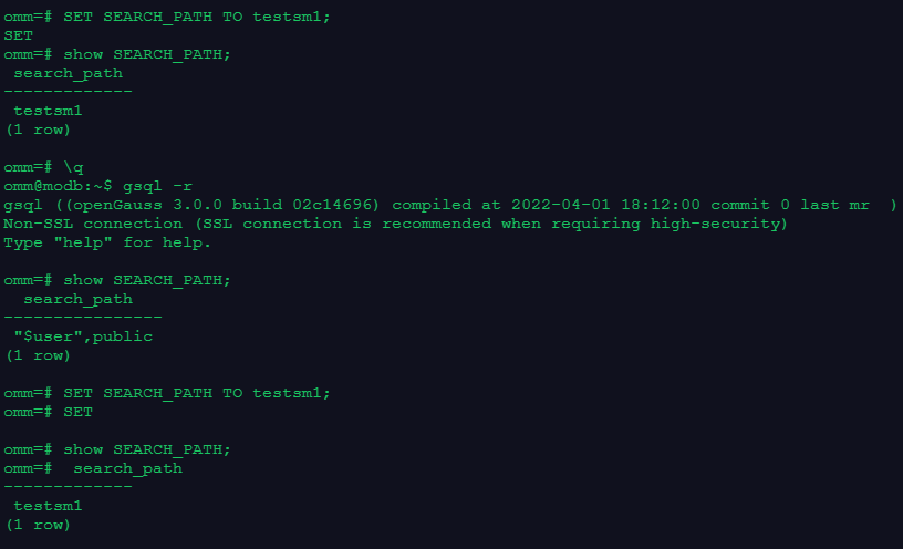 注:可以看到在会话级设置模式搜索顺序,在退出当前会话后就会失效