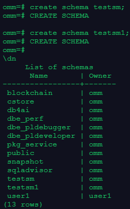 1.创建一个名为testsm、testsm1的模式;