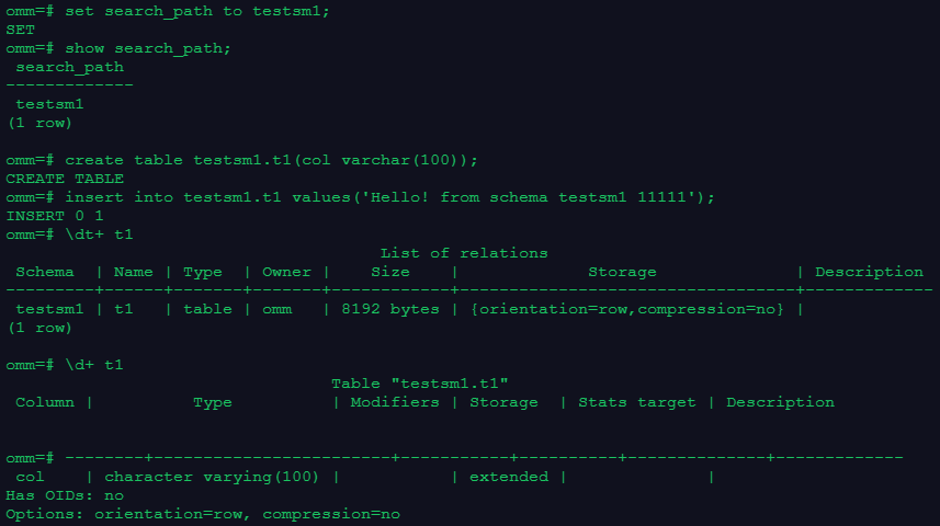 4.在模式testsm1中建表t1、插入记录和查询记录;