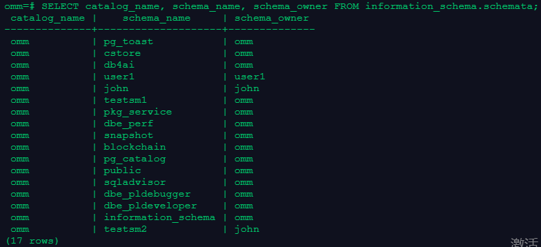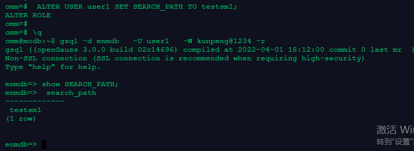 修改数据库级别的搜索顺序后,数据库用户user1再次登录到数据库enmdb,其模式搜索路径已经变更为数据库默认的模式搜索路径testsm1。ALTER DATABASE enmdb SET SEARCH_PATH TO testsm1;