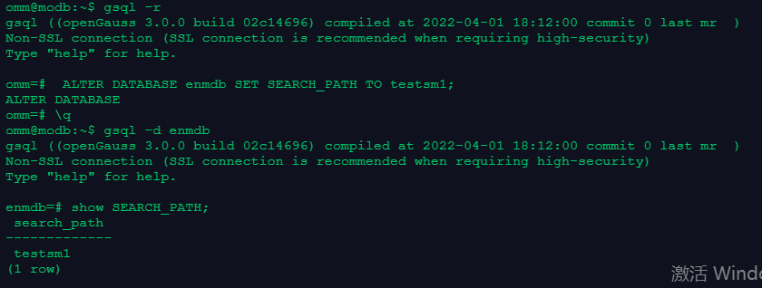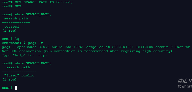 在gsql客户端会话中,执行命令SET SEARCH_PATH TO testsm1可以修改模式搜索路径,但只在gsql客户端会话的持续过程中起作用,一旦退出gsql客户端会话,这个设置就丢失了。重新登录gsql会话将模式搜索路径恢复为默认值"$user",public。