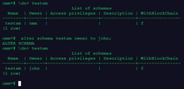 2.创建一个用户john, 并将testsm的owner修改为john,且修改owner前后分别使用\dn+查看模式信息