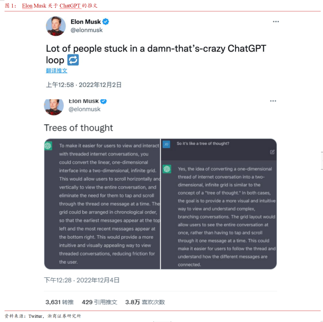 当地时间11月30日,OpenAI 发布了全新的聊天机器人模型 ChatGPT。ChatGPT 是 OpenAI 训练的对话式大规模语言模型,是 InstructGPT 的兄弟模型,二者同属 GPT-3.5 系列的主力模型。ChatGPT 目前处于测试阶段,拥有 OpenAI 账户的用户可以免费使用。模型采用对话格式,可以跟进回答问题、承认错误、挑战不正确的前提并拒绝不正当的请求,且支持中文。模型一经推出,就引起较高关注度和讨论度。作为 OpenAI 投资人,马斯克在社交媒体上展示了自己询问 ChatGPT 怎么设计 Twitter 得到的回复,拓展此事件影响力。