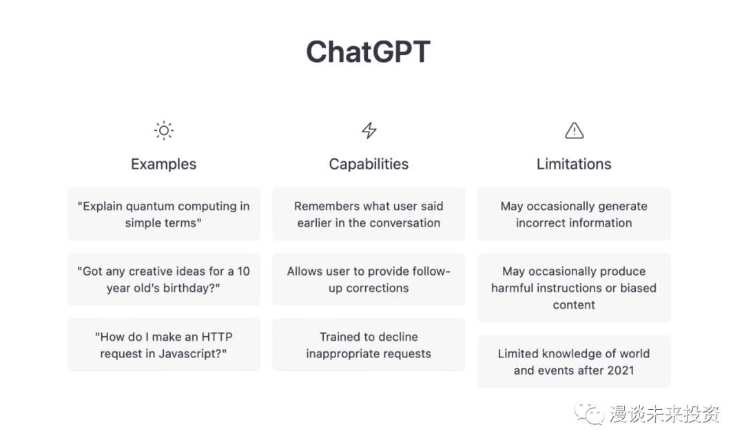 OpenAi 刚刚发布了基于 GPT-3.5 模型的产品 ChatGPT 聊天机器人,她能做什么事情呢,网站上给了一个例子: