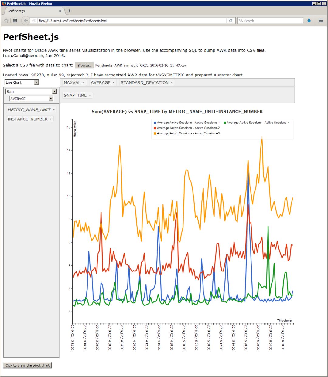 PerfSheet.js是一个针对Oracle的性能分析工具,直接在浏览器中可以生成各种AWR的趋势报告,如活动会话数、物理读等,极大的简化了之前多个ARW对比趋势,或者运行各个SQL对比的繁琐步骤。另外PerfSheet4需要依赖于Excel,而PerfSheet.js用javascript编写并可以在浏览器中运行,这提供了跨平台的额外灵活性和兼容性。