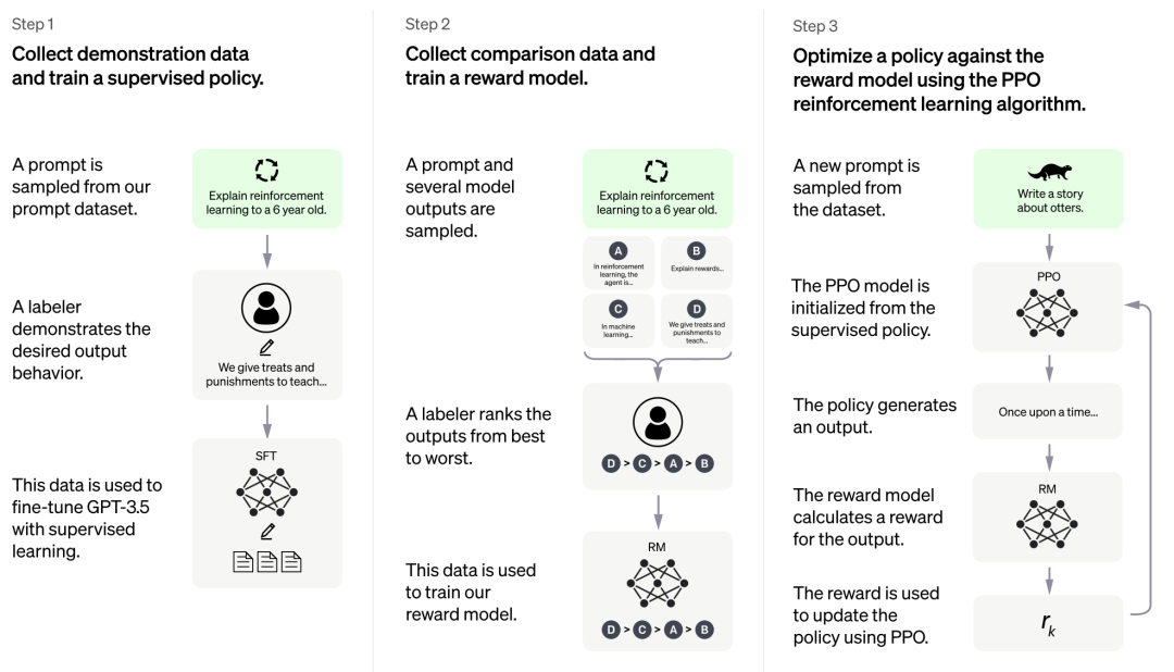 根据OpanAI官网的介绍,ChatGPT是经过优化的用于交互对话的语言模型,对话格式使ChatGPT能够回答后续问题、承认错误、质疑不正确的前提和拒绝不适当的请求等。ChatGPT是在GPT-3.5系列中的一个模型上进行微调而成,是InstructGPT的兄弟模型,后者经过训练,可以遵循提示中的指令并提供详细的响应。具体的方法详见下图。