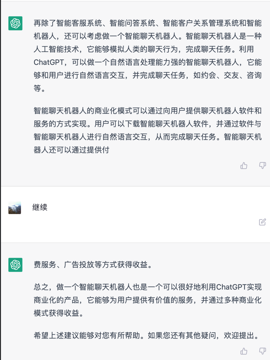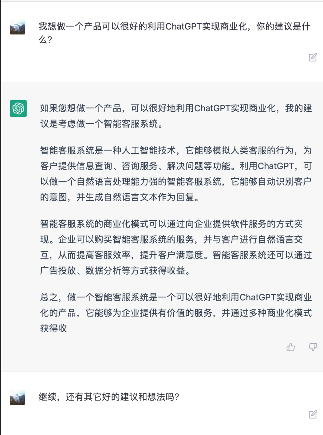 好吧,暂时测试到这里吧。我个人的突出感受是:ChatGPT利用自然语言的对话能力确实非常强,目前对中文也非常友好,对话的语言出奇的通顺,虽然实用性还不是特别强,有些回答是逻辑严谨的废话,但可以尝试做一个小助手了,对有些工种的影响可能真的已经开始。你的感受如何,强烈建议你注册一个账号测试一下,你将感受到智能、好玩、震惊......,AI的通用对话能力可能比你想象的大很多,也许有一天你遇到问题时不是想到用搜索引擎、看书、找专家交流,而是直接和AI对话。