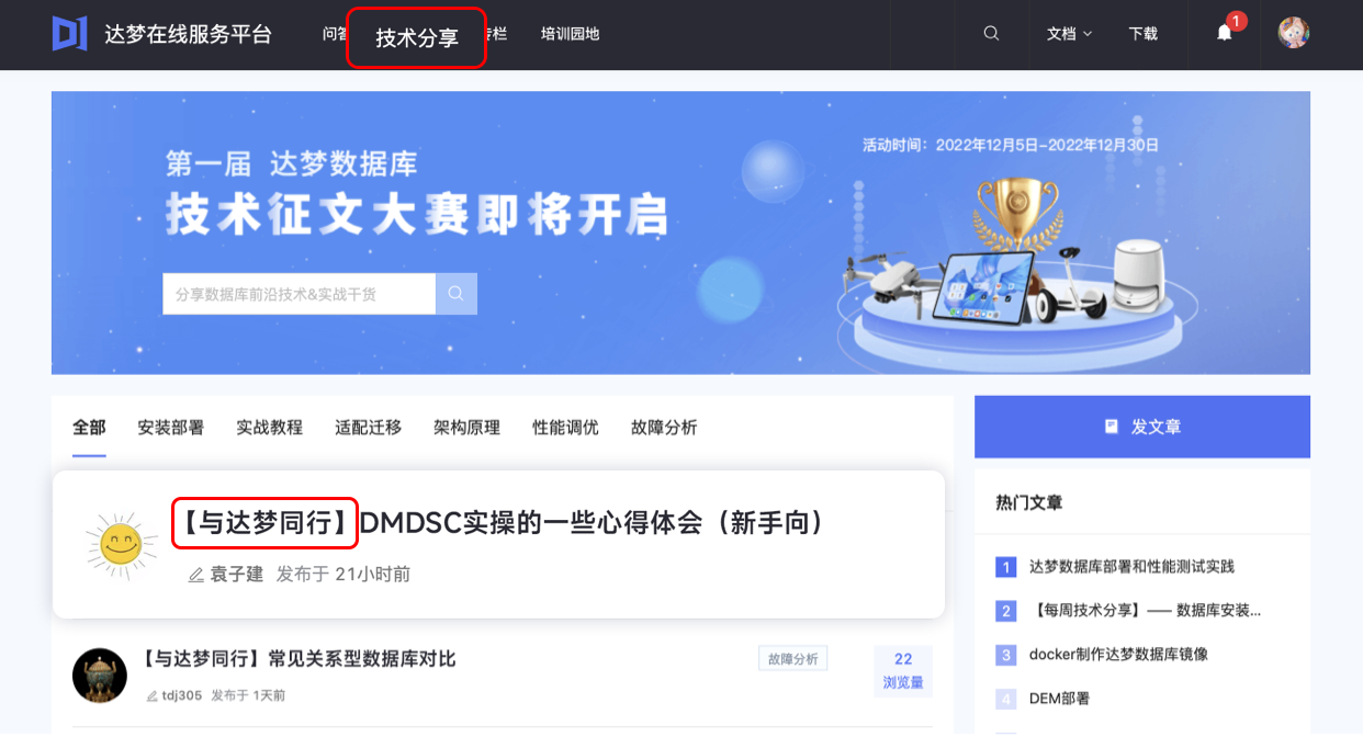 在达梦在线服务平台 社区—技术分享专区 发布参赛文章,文章标题前添加标签【与达梦同行】。