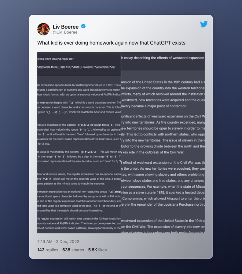 YouTube 上的用户 Liv Boeree 认为孩子们花几个小时做家庭作业将成为过去——ChatGPT 将为他们完成这项工作。她让机器人写了一篇完整的 4 段文章,还解决了一个复杂的数学方程式。