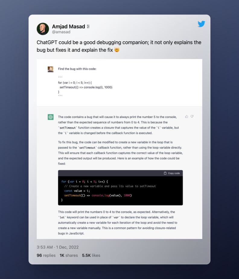 软件初创公司创始人阿姆贾德马萨德(AmjadMasad)让 ChatGPT 发现他的代码中的错误,并生成有关代码错误以及如何修复的详细输出。