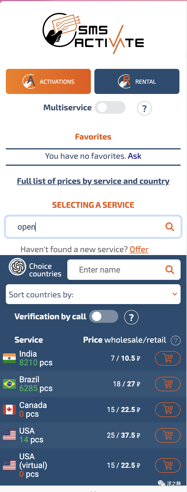 来进行短信接收。点击官网进入,有账号的直接搜索服务购买,没有账号的先去注册(常规操作,没啥可说的)。注册完成,在登录后点击右上角的充值按钮进行充值(最小充值可以根据需要购买的服务自己进行计算,以印度单次购买为例:10.5 ₽ 大约充值 $ 0.17 左右),然后在首页左侧搜索服务选择国家加入购物车。