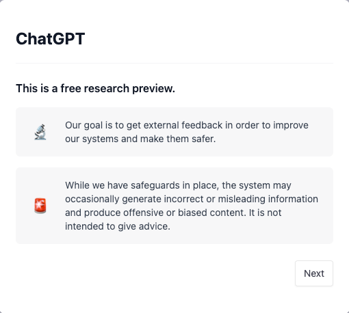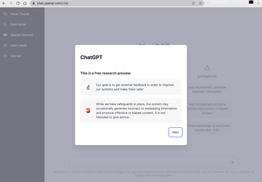 访问:https://chat.openai.com/chat 进入网站,首先有一些说明:
