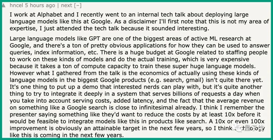 还有理性的网友指出,ChatGPT想要替代谷歌也没那么容易。一位在Alphabet工作的网友就现身说法,谷歌也不是没有考虑过在搜索引擎中引用大模型,但最大的问题是成本太高了。