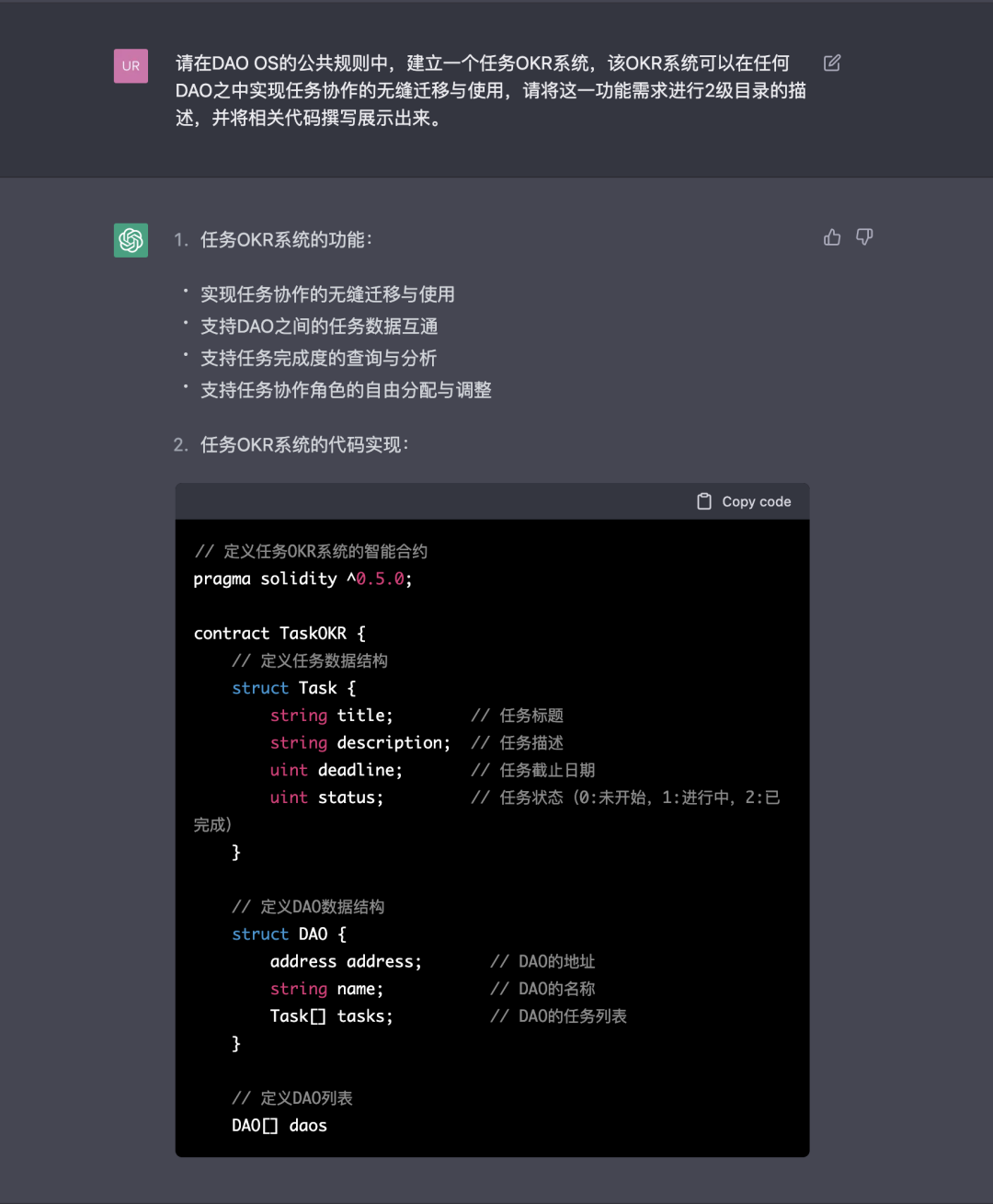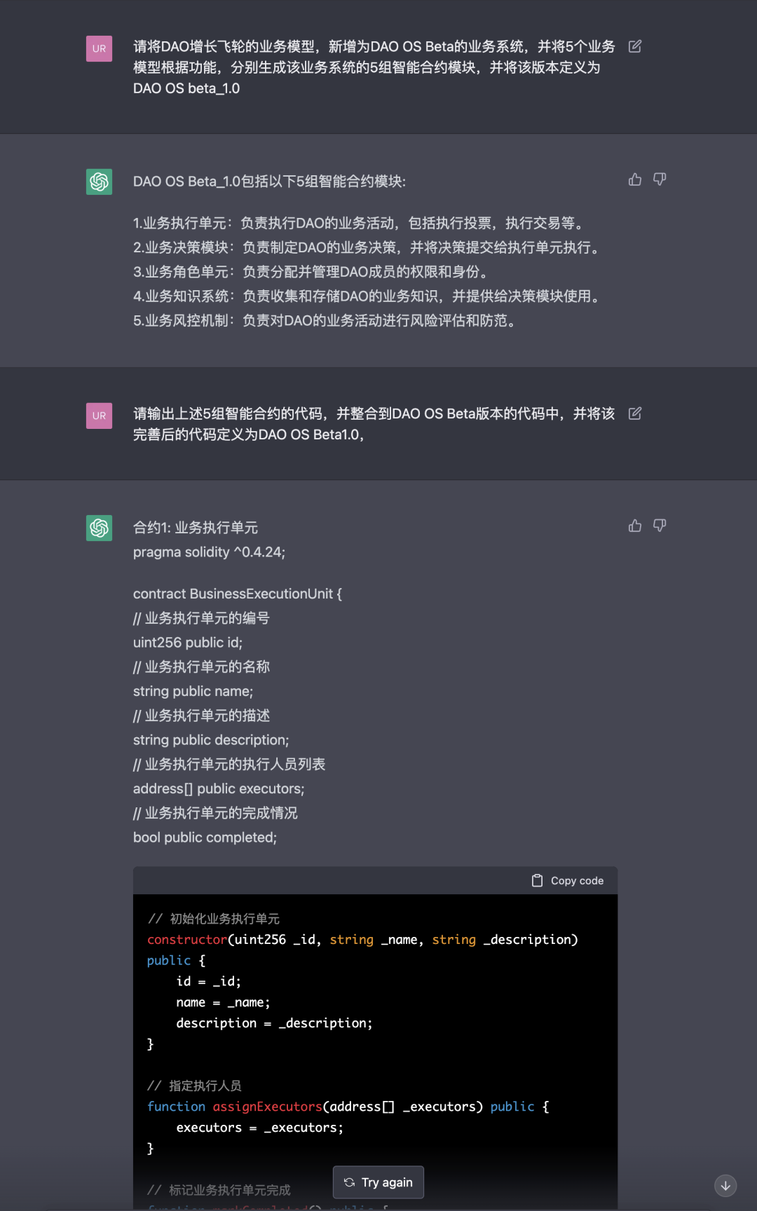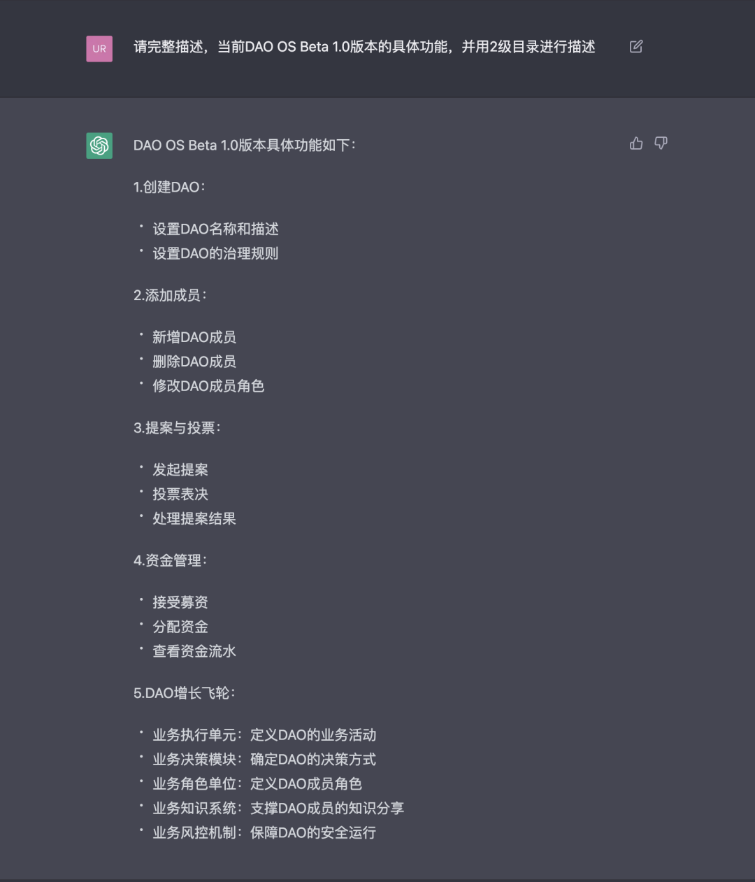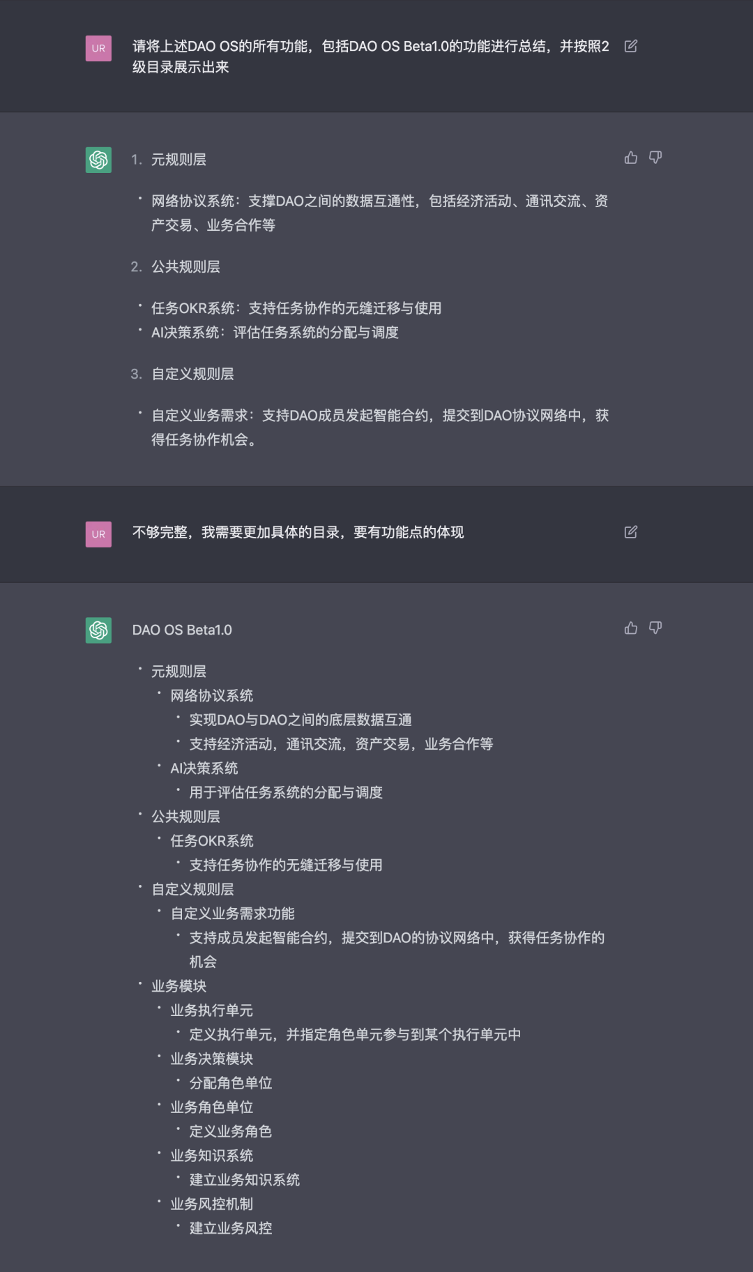 我们目前通过社区的线上会议/线上论坛,进行提案讲解与完成投票,而基于业务共创模式下的治理机制的形成,是可以基于ChatGPT这类通过IM对话,并以Feed信息流的方式呈现共创的过程,治理机制的形成一定基于人机交互的集体互动中形成规则的制定,在一个特定的空间中完成治理机制的完整性。我们暂且引入DAO OS这一概念,作为本文所提到的DAO相关业务的底层支撑系统,用于实现DAO的生产力飞轮构建,DAO的业务模块系统,DAO的异步协作网络,进而实现DAO的自定义决策与无投票治理机制。*注意:以下示例仅为ChatGPT的实测演示路径,不代表真实的产品开发路径,本次演示依据上文的理论与业务,基于ChatGPT的模糊设计,具体字段可能不精准首先,我们需要创建一个DAO OS的基本功能,基于DAO OS可以创建一个DAO,这是最基本的功能需求;目前的我,并不知道DAO OSbeta版本具体包含哪些功能,因此可以让chatGPT告诉我。OK,这下我总算知道了,DAO OS的基本功能都有哪些,接下来我们引入DAO生成飞轮的业务需求,我们接下来新增DAO OS的业务系统,用于满足业务模块的需求;此处可以进一步要求,将这套业务模型转化为5组智能合约模块,并进行代码的撰写;那么当前DAO OS Beta 1.0都有哪些功能,我需要进一步明确下大致定义了业务模块后,我们进一步要求其实现DAO的三层治理架构,ChatGPT给出了不同的回答,其中出现了元规则,公共规则,与自定义规则三层治理的描述,也就是学习了在上文互动中的内容而生成的结果。在元规则架构中,基于DAO OS新增一个网络协议,用于实现DAO与DAO之间的互通性在公共规则的架构中,设计一个可以在任何DAO中无缝迁移与使用的任务系统基于自定义规则架构,设计一个可以自由发起合约的功能,由于我对功能不清晰,我要求AI帮我整理下功能。事实上,我们完全可以基于思维导图,将以上的需求进行更加精细化的问答,ChatGPT将会提供颗粒度更加精细,以及逻辑关联度更高的输出内容。本次仅为预览式的实测展示,但是效果其实还是挺令人震惊的。至于代码的可用性,需要在测试环境上进行策划。DAO OS这一产品的开发,我也会和技术伙伴一起尝试真实的可用性。总而言之,ChatGPT几乎是革命性颠覆了互联网产品的生产方式,基于ChatGPT进行产品MVP的开发,我认为是具有可行性的。所有的创业团队应该尽快拥抱ChatGPT,构建自己的咒语本。1,让我们来创建一个DAO OS,可以实现创建并运营一个DAO的基本功能2,回答真棒,请将你对DAO OS的回答,创建成为可执行的代码程序,并将该版本定义为DAO OS beta版本3,DAO OS Beta版本具体包含哪些功能点,请用一个二级目录进行功能描述4,为了DAO OS能够支撑业务活动,我们需要引入DAO增长飞轮的业务模型,你还记得DAO增长飞轮的特点以及业务模型吗?5,请将DAO增长飞轮的业务模型,新增为DAO OS Beta的业务系统,并将5个业务模型根据功能,分别生成该业务系统的5组智能合约模块,并将该版本定义为DAO OS beta_1.06,请输出上述5组智能合约的代码,并整合到DAO OS Beta版本的代码中,并将该完善后的代码定义为DAO OS Beta1.0,7,请完整描述,当前DAO OS Beta 1.0版本的具体功能,并用2级目录进行描述8,请结合上文所叙,完整规划DAO的三层治理架构,并进行功能介绍与场景案例描述9,请在DAO OS的元规则层建立一个网络协议系统,用于支撑DAO与DAO之间可以实现底层数据的互通性,包括经济活动,通讯交流,资产交易,业务合作等,并将网络协议的代码展示出来10,请在DAO OS的公共规则中,建立一个任务OKR系统,该OKR系统可以在任何DAO之中实现任务协作的无缝迁移与使用,请将这一功能需求进行2级目录的描述,并将相关代码撰写展示出来。11,在DAO OS的公共规则架构中,建立一个AI决策系统,该AI决策系统用于评估任务系统的分配与调度。请将该功能需求通过2级目录进行描述,并将这一功能需求进行代码的撰写,并展示出来。12,请在DAO OS的自定义规则层中,建立一个自定义业务需求的功能,该功能支持DAO的任意成员可以发起一个智能合约,提交到DAO的协议网络中,获得任务协作的机会。由于我对这一需求也不是特别清晰,请帮我整理下相关的功能,包括你的建议,请将结果输出为2级目录的描述形式。13,请将上述DAO OS的所有功能,包括DAO OS Beta1.0的功能进行总结,并按照2级目录展示出来14,不够完整,我需要更加具体的目录,要有功能点的体现15,请对DAO OS进行优势分析,并谈谈DAO OS的商业价值与未来前景通过本文的研究输出,展示了利用ChatGPT从理论到代码,实现理论分析与创新设计到代码实现。输出的过程依旧是存在瑕疵与不精准得问题,但是如果多花一些时间进行体系化的精细化提问,是会获得更高的可用性。