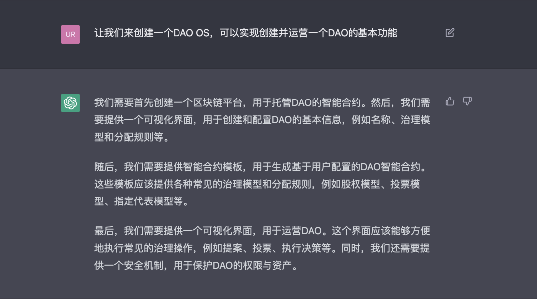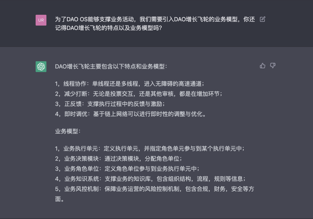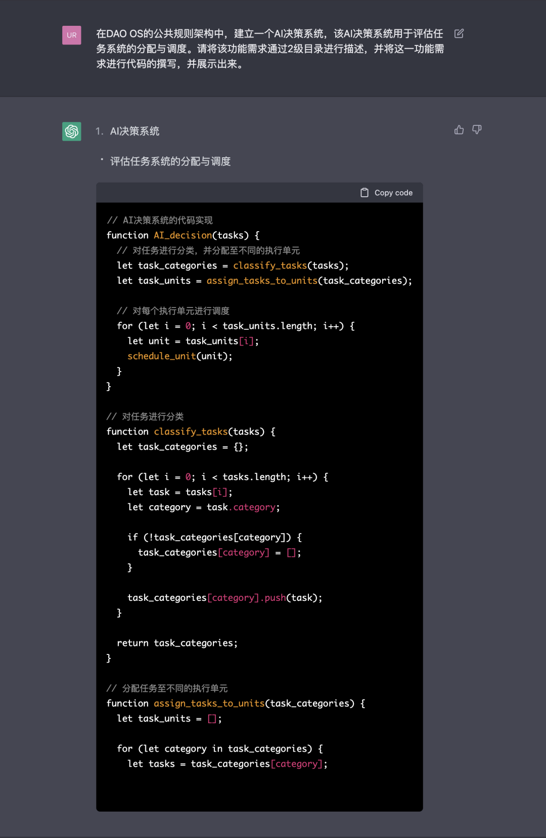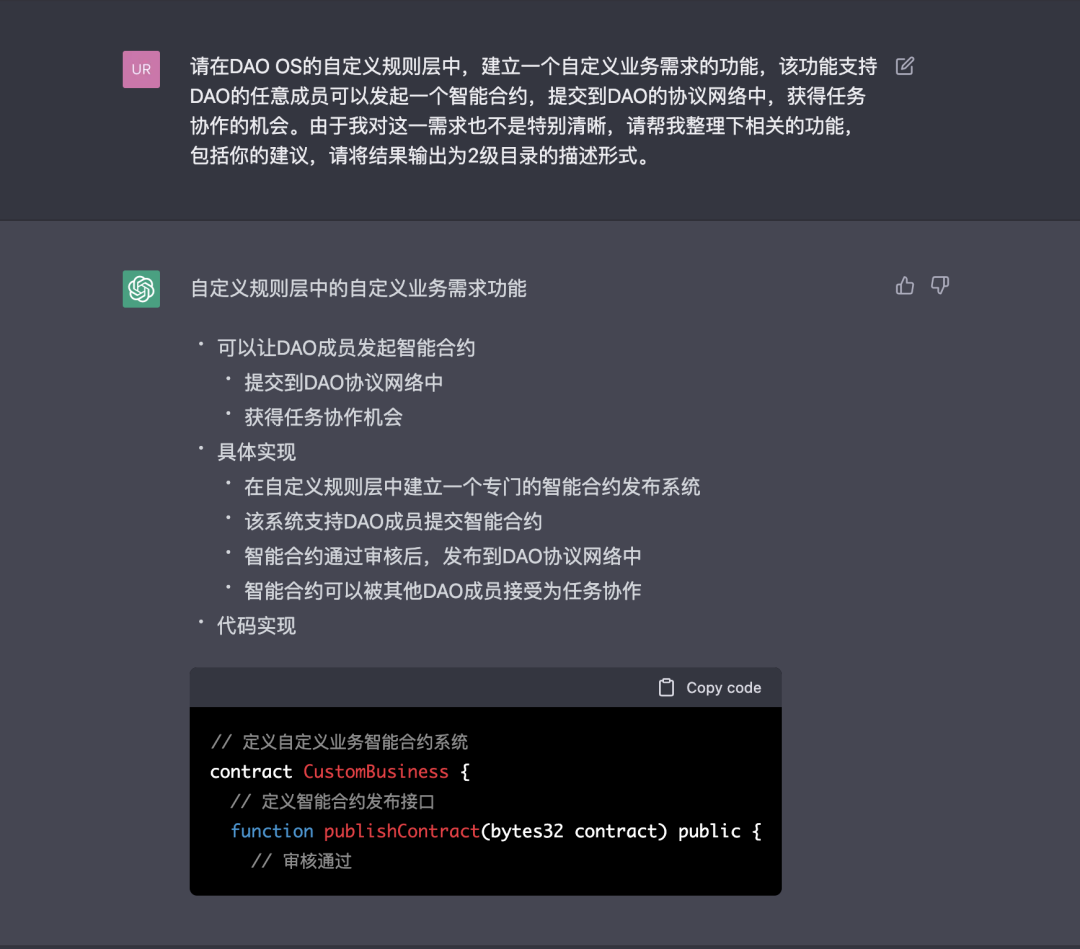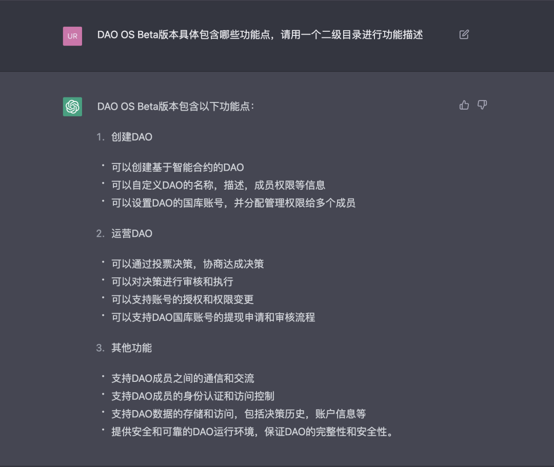 我们目前通过社区的线上会议/线上论坛,进行提案讲解与完成投票,而基于业务共创模式下的治理机制的形成,是可以基于ChatGPT这类通过IM对话,并以Feed信息流的方式呈现共创的过程,治理机制的形成一定基于人机交互的集体互动中形成规则的制定,在一个特定的空间中完成治理机制的完整性。我们暂且引入DAO OS这一概念,作为本文所提到的DAO相关业务的底层支撑系统,用于实现DAO的生产力飞轮构建,DAO的业务模块系统,DAO的异步协作网络,进而实现DAO的自定义决策与无投票治理机制。*注意:以下示例仅为ChatGPT的实测演示路径,不代表真实的产品开发路径,本次演示依据上文的理论与业务,基于ChatGPT的模糊设计,具体字段可能不精准首先,我们需要创建一个DAO OS的基本功能,基于DAO OS可以创建一个DAO,这是最基本的功能需求;目前的我,并不知道DAO OSbeta版本具体包含哪些功能,因此可以让chatGPT告诉我。OK,这下我总算知道了,DAO OS的基本功能都有哪些,接下来我们引入DAO生成飞轮的业务需求,我们接下来新增DAO OS的业务系统,用于满足业务模块的需求;此处可以进一步要求,将这套业务模型转化为5组智能合约模块,并进行代码的撰写;那么当前DAO OS Beta 1.0都有哪些功能,我需要进一步明确下大致定义了业务模块后,我们进一步要求其实现DAO的三层治理架构,ChatGPT给出了不同的回答,其中出现了元规则,公共规则,与自定义规则三层治理的描述,也就是学习了在上文互动中的内容而生成的结果。在元规则架构中,基于DAO OS新增一个网络协议,用于实现DAO与DAO之间的互通性在公共规则的架构中,设计一个可以在任何DAO中无缝迁移与使用的任务系统基于自定义规则架构,设计一个可以自由发起合约的功能,由于我对功能不清晰,我要求AI帮我整理下功能。事实上,我们完全可以基于思维导图,将以上的需求进行更加精细化的问答,ChatGPT将会提供颗粒度更加精细,以及逻辑关联度更高的输出内容。本次仅为预览式的实测展示,但是效果其实还是挺令人震惊的。至于代码的可用性,需要在测试环境上进行策划。DAO OS这一产品的开发,我也会和技术伙伴一起尝试真实的可用性。总而言之,ChatGPT几乎是革命性颠覆了互联网产品的生产方式,基于ChatGPT进行产品MVP的开发,我认为是具有可行性的。所有的创业团队应该尽快拥抱ChatGPT,构建自己的咒语本。1,让我们来创建一个DAO OS,可以实现创建并运营一个DAO的基本功能2,回答真棒,请将你对DAO OS的回答,创建成为可执行的代码程序,并将该版本定义为DAO OS beta版本3,DAO OS Beta版本具体包含哪些功能点,请用一个二级目录进行功能描述4,为了DAO OS能够支撑业务活动,我们需要引入DAO增长飞轮的业务模型,你还记得DAO增长飞轮的特点以及业务模型吗?5,请将DAO增长飞轮的业务模型,新增为DAO OS Beta的业务系统,并将5个业务模型根据功能,分别生成该业务系统的5组智能合约模块,并将该版本定义为DAO OS beta_1.06,请输出上述5组智能合约的代码,并整合到DAO OS Beta版本的代码中,并将该完善后的代码定义为DAO OS Beta1.0,7,请完整描述,当前DAO OS Beta 1.0版本的具体功能,并用2级目录进行描述8,请结合上文所叙,完整规划DAO的三层治理架构,并进行功能介绍与场景案例描述9,请在DAO OS的元规则层建立一个网络协议系统,用于支撑DAO与DAO之间可以实现底层数据的互通性,包括经济活动,通讯交流,资产交易,业务合作等,并将网络协议的代码展示出来10,请在DAO OS的公共规则中,建立一个任务OKR系统,该OKR系统可以在任何DAO之中实现任务协作的无缝迁移与使用,请将这一功能需求进行2级目录的描述,并将相关代码撰写展示出来。11,在DAO OS的公共规则架构中,建立一个AI决策系统,该AI决策系统用于评估任务系统的分配与调度。请将该功能需求通过2级目录进行描述,并将这一功能需求进行代码的撰写,并展示出来。12,请在DAO OS的自定义规则层中,建立一个自定义业务需求的功能,该功能支持DAO的任意成员可以发起一个智能合约,提交到DAO的协议网络中,获得任务协作的机会。由于我对这一需求也不是特别清晰,请帮我整理下相关的功能,包括你的建议,请将结果输出为2级目录的描述形式。13,请将上述DAO OS的所有功能,包括DAO OS Beta1.0的功能进行总结,并按照2级目录展示出来14,不够完整,我需要更加具体的目录,要有功能点的体现15,请对DAO OS进行优势分析,并谈谈DAO OS的商业价值与未来前景通过本文的研究输出,展示了利用ChatGPT从理论到代码,实现理论分析与创新设计到代码实现。输出的过程依旧是存在瑕疵与不精准得问题,但是如果多花一些时间进行体系化的精细化提问,是会获得更高的可用性。