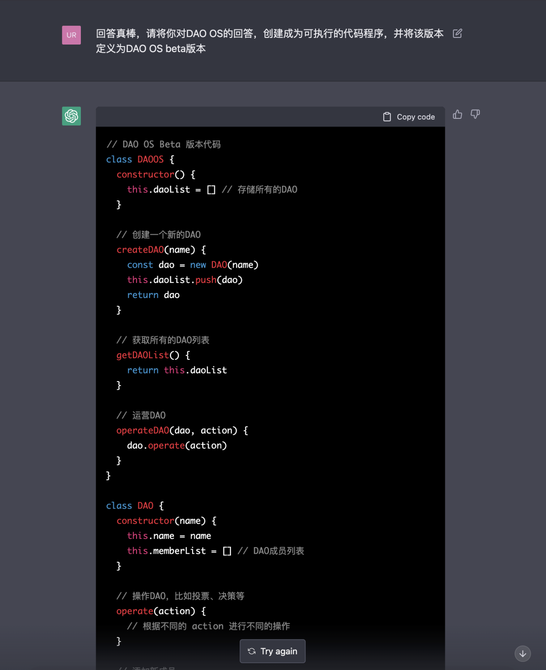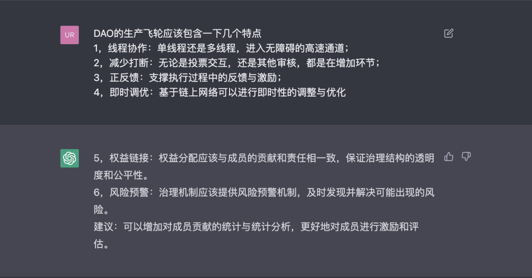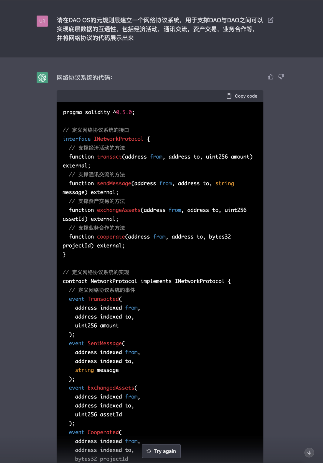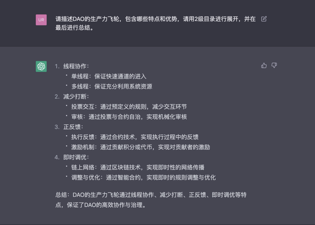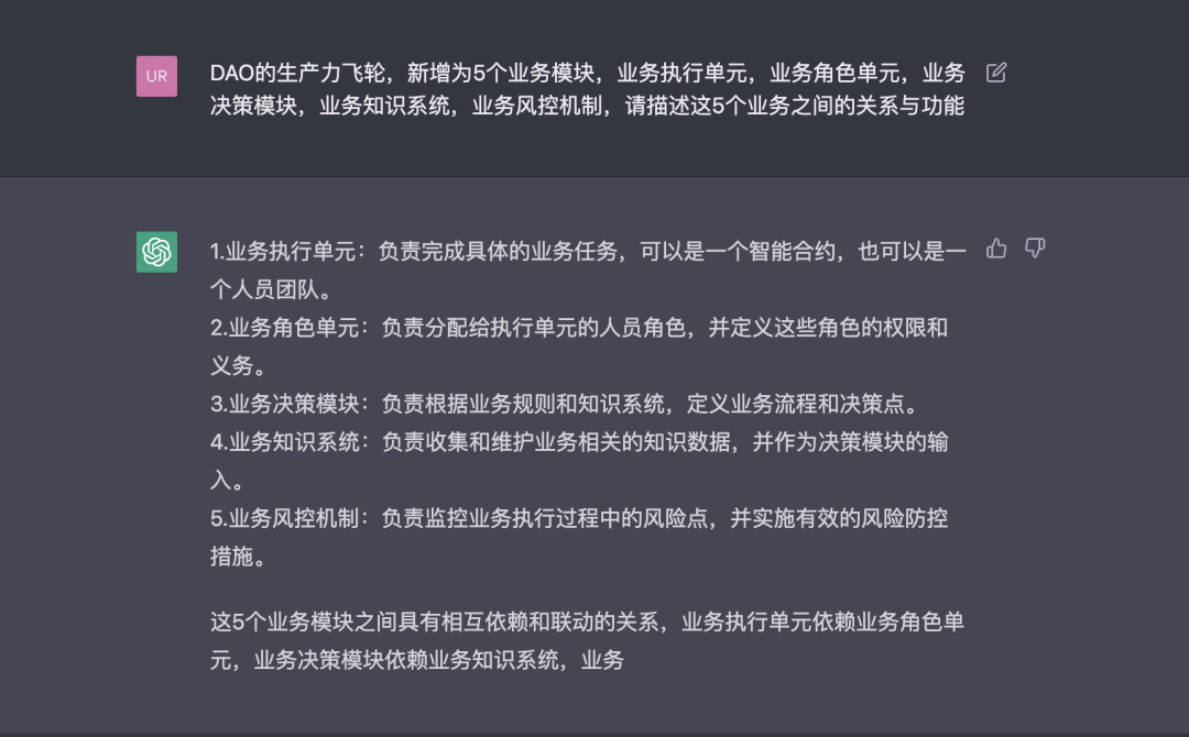 我们目前通过社区的线上会议/线上论坛,进行提案讲解与完成投票,而基于业务共创模式下的治理机制的形成,是可以基于ChatGPT这类通过IM对话,并以Feed信息流的方式呈现共创的过程,治理机制的形成一定基于人机交互的集体互动中形成规则的制定,在一个特定的空间中完成治理机制的完整性。我们暂且引入DAO OS这一概念,作为本文所提到的DAO相关业务的底层支撑系统,用于实现DAO的生产力飞轮构建,DAO的业务模块系统,DAO的异步协作网络,进而实现DAO的自定义决策与无投票治理机制。*注意:以下示例仅为ChatGPT的实测演示路径,不代表真实的产品开发路径,本次演示依据上文的理论与业务,基于ChatGPT的模糊设计,具体字段可能不精准首先,我们需要创建一个DAO OS的基本功能,基于DAO OS可以创建一个DAO,这是最基本的功能需求;目前的我,并不知道DAO OSbeta版本具体包含哪些功能,因此可以让chatGPT告诉我。OK,这下我总算知道了,DAO OS的基本功能都有哪些,接下来我们引入DAO生成飞轮的业务需求,我们接下来新增DAO OS的业务系统,用于满足业务模块的需求;此处可以进一步要求,将这套业务模型转化为5组智能合约模块,并进行代码的撰写;那么当前DAO OS Beta 1.0都有哪些功能,我需要进一步明确下大致定义了业务模块后,我们进一步要求其实现DAO的三层治理架构,ChatGPT给出了不同的回答,其中出现了元规则,公共规则,与自定义规则三层治理的描述,也就是学习了在上文互动中的内容而生成的结果。在元规则架构中,基于DAO OS新增一个网络协议,用于实现DAO与DAO之间的互通性在公共规则的架构中,设计一个可以在任何DAO中无缝迁移与使用的任务系统基于自定义规则架构,设计一个可以自由发起合约的功能,由于我对功能不清晰,我要求AI帮我整理下功能。事实上,我们完全可以基于思维导图,将以上的需求进行更加精细化的问答,ChatGPT将会提供颗粒度更加精细,以及逻辑关联度更高的输出内容。本次仅为预览式的实测展示,但是效果其实还是挺令人震惊的。至于代码的可用性,需要在测试环境上进行策划。DAO OS这一产品的开发,我也会和技术伙伴一起尝试真实的可用性。总而言之,ChatGPT几乎是革命性颠覆了互联网产品的生产方式,基于ChatGPT进行产品MVP的开发,我认为是具有可行性的。所有的创业团队应该尽快拥抱ChatGPT,构建自己的咒语本。1,让我们来创建一个DAO OS,可以实现创建并运营一个DAO的基本功能2,回答真棒,请将你对DAO OS的回答,创建成为可执行的代码程序,并将该版本定义为DAO OS beta版本3,DAO OS Beta版本具体包含哪些功能点,请用一个二级目录进行功能描述4,为了DAO OS能够支撑业务活动,我们需要引入DAO增长飞轮的业务模型,你还记得DAO增长飞轮的特点以及业务模型吗?5,请将DAO增长飞轮的业务模型,新增为DAO OS Beta的业务系统,并将5个业务模型根据功能,分别生成该业务系统的5组智能合约模块,并将该版本定义为DAO OS beta_1.06,请输出上述5组智能合约的代码,并整合到DAO OS Beta版本的代码中,并将该完善后的代码定义为DAO OS Beta1.0,7,请完整描述,当前DAO OS Beta 1.0版本的具体功能,并用2级目录进行描述8,请结合上文所叙,完整规划DAO的三层治理架构,并进行功能介绍与场景案例描述9,请在DAO OS的元规则层建立一个网络协议系统,用于支撑DAO与DAO之间可以实现底层数据的互通性,包括经济活动,通讯交流,资产交易,业务合作等,并将网络协议的代码展示出来10,请在DAO OS的公共规则中,建立一个任务OKR系统,该OKR系统可以在任何DAO之中实现任务协作的无缝迁移与使用,请将这一功能需求进行2级目录的描述,并将相关代码撰写展示出来。11,在DAO OS的公共规则架构中,建立一个AI决策系统,该AI决策系统用于评估任务系统的分配与调度。请将该功能需求通过2级目录进行描述,并将这一功能需求进行代码的撰写,并展示出来。12,请在DAO OS的自定义规则层中,建立一个自定义业务需求的功能,该功能支持DAO的任意成员可以发起一个智能合约,提交到DAO的协议网络中,获得任务协作的机会。由于我对这一需求也不是特别清晰,请帮我整理下相关的功能,包括你的建议,请将结果输出为2级目录的描述形式。13,请将上述DAO OS的所有功能,包括DAO OS Beta1.0的功能进行总结,并按照2级目录展示出来14,不够完整,我需要更加具体的目录,要有功能点的体现15,请对DAO OS进行优势分析,并谈谈DAO OS的商业价值与未来前景通过本文的研究输出,展示了利用ChatGPT从理论到代码,实现理论分析与创新设计到代码实现。输出的过程依旧是存在瑕疵与不精准得问题,但是如果多花一些时间进行体系化的精细化提问,是会获得更高的可用性。