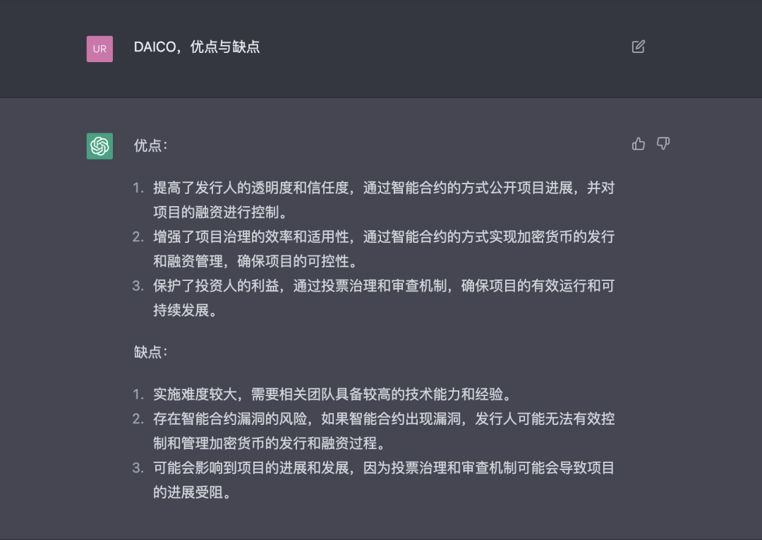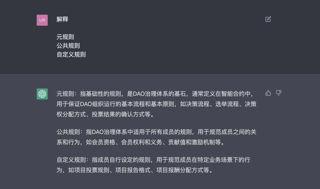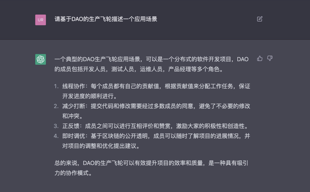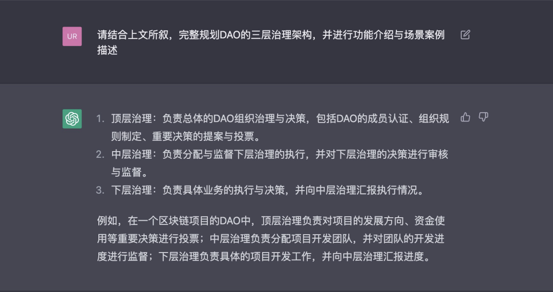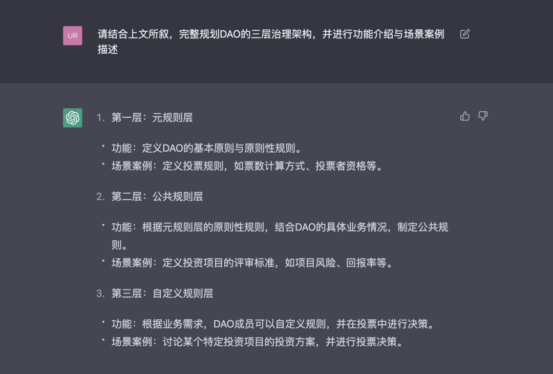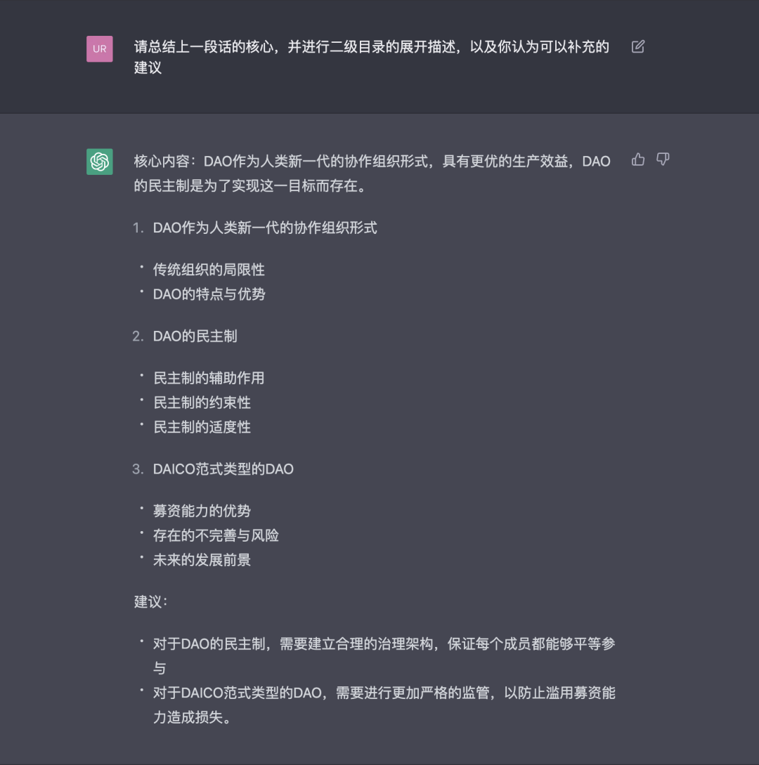 我们目前通过社区的线上会议/线上论坛,进行提案讲解与完成投票,而基于业务共创模式下的治理机制的形成,是可以基于ChatGPT这类通过IM对话,并以Feed信息流的方式呈现共创的过程,治理机制的形成一定基于人机交互的集体互动中形成规则的制定,在一个特定的空间中完成治理机制的完整性。我们暂且引入DAO OS这一概念,作为本文所提到的DAO相关业务的底层支撑系统,用于实现DAO的生产力飞轮构建,DAO的业务模块系统,DAO的异步协作网络,进而实现DAO的自定义决策与无投票治理机制。*注意:以下示例仅为ChatGPT的实测演示路径,不代表真实的产品开发路径,本次演示依据上文的理论与业务,基于ChatGPT的模糊设计,具体字段可能不精准首先,我们需要创建一个DAO OS的基本功能,基于DAO OS可以创建一个DAO,这是最基本的功能需求;目前的我,并不知道DAO OSbeta版本具体包含哪些功能,因此可以让chatGPT告诉我。OK,这下我总算知道了,DAO OS的基本功能都有哪些,接下来我们引入DAO生成飞轮的业务需求,我们接下来新增DAO OS的业务系统,用于满足业务模块的需求;此处可以进一步要求,将这套业务模型转化为5组智能合约模块,并进行代码的撰写;那么当前DAO OS Beta 1.0都有哪些功能,我需要进一步明确下大致定义了业务模块后,我们进一步要求其实现DAO的三层治理架构,ChatGPT给出了不同的回答,其中出现了元规则,公共规则,与自定义规则三层治理的描述,也就是学习了在上文互动中的内容而生成的结果。在元规则架构中,基于DAO OS新增一个网络协议,用于实现DAO与DAO之间的互通性在公共规则的架构中,设计一个可以在任何DAO中无缝迁移与使用的任务系统基于自定义规则架构,设计一个可以自由发起合约的功能,由于我对功能不清晰,我要求AI帮我整理下功能。事实上,我们完全可以基于思维导图,将以上的需求进行更加精细化的问答,ChatGPT将会提供颗粒度更加精细,以及逻辑关联度更高的输出内容。本次仅为预览式的实测展示,但是效果其实还是挺令人震惊的。至于代码的可用性,需要在测试环境上进行策划。DAO OS这一产品的开发,我也会和技术伙伴一起尝试真实的可用性。总而言之,ChatGPT几乎是革命性颠覆了互联网产品的生产方式,基于ChatGPT进行产品MVP的开发,我认为是具有可行性的。所有的创业团队应该尽快拥抱ChatGPT,构建自己的咒语本。1,让我们来创建一个DAO OS,可以实现创建并运营一个DAO的基本功能2,回答真棒,请将你对DAO OS的回答,创建成为可执行的代码程序,并将该版本定义为DAO OS beta版本3,DAO OS Beta版本具体包含哪些功能点,请用一个二级目录进行功能描述4,为了DAO OS能够支撑业务活动,我们需要引入DAO增长飞轮的业务模型,你还记得DAO增长飞轮的特点以及业务模型吗?5,请将DAO增长飞轮的业务模型,新增为DAO OS Beta的业务系统,并将5个业务模型根据功能,分别生成该业务系统的5组智能合约模块,并将该版本定义为DAO OS beta_1.06,请输出上述5组智能合约的代码,并整合到DAO OS Beta版本的代码中,并将该完善后的代码定义为DAO OS Beta1.0,7,请完整描述,当前DAO OS Beta 1.0版本的具体功能,并用2级目录进行描述8,请结合上文所叙,完整规划DAO的三层治理架构,并进行功能介绍与场景案例描述9,请在DAO OS的元规则层建立一个网络协议系统,用于支撑DAO与DAO之间可以实现底层数据的互通性,包括经济活动,通讯交流,资产交易,业务合作等,并将网络协议的代码展示出来10,请在DAO OS的公共规则中,建立一个任务OKR系统,该OKR系统可以在任何DAO之中实现任务协作的无缝迁移与使用,请将这一功能需求进行2级目录的描述,并将相关代码撰写展示出来。11,在DAO OS的公共规则架构中,建立一个AI决策系统,该AI决策系统用于评估任务系统的分配与调度。请将该功能需求通过2级目录进行描述,并将这一功能需求进行代码的撰写,并展示出来。12,请在DAO OS的自定义规则层中,建立一个自定义业务需求的功能,该功能支持DAO的任意成员可以发起一个智能合约,提交到DAO的协议网络中,获得任务协作的机会。由于我对这一需求也不是特别清晰,请帮我整理下相关的功能,包括你的建议,请将结果输出为2级目录的描述形式。13,请将上述DAO OS的所有功能,包括DAO OS Beta1.0的功能进行总结,并按照2级目录展示出来14,不够完整,我需要更加具体的目录,要有功能点的体现15,请对DAO OS进行优势分析,并谈谈DAO OS的商业价值与未来前景通过本文的研究输出,展示了利用ChatGPT从理论到代码,实现理论分析与创新设计到代码实现。输出的过程依旧是存在瑕疵与不精准得问题,但是如果多花一些时间进行体系化的精细化提问,是会获得更高的可用性。