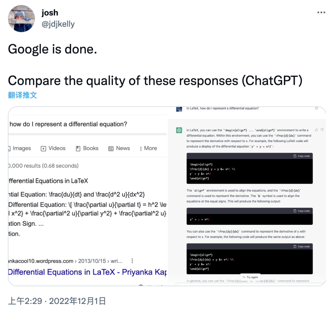 有人还将ChatGPT的回复与谷歌搜索结果对比,惊讶地发现ChatGPT在实用性上强太多;甚至有人预言如果谷歌不做出改变很快就会被淘汰,到时候自己愿意每月花15-20美元使用ChatGPT。