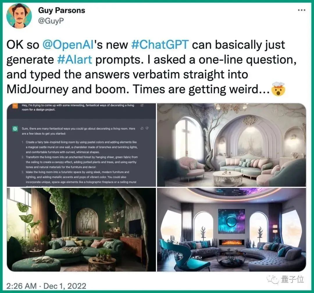 还有许多机智的网友,用ChatGPT来搞设计,让ChatGPT给自己设计卧室,然后用它给出的文字做提示词,去MidJourney生成图像,连请设计公司的钱都省了。
