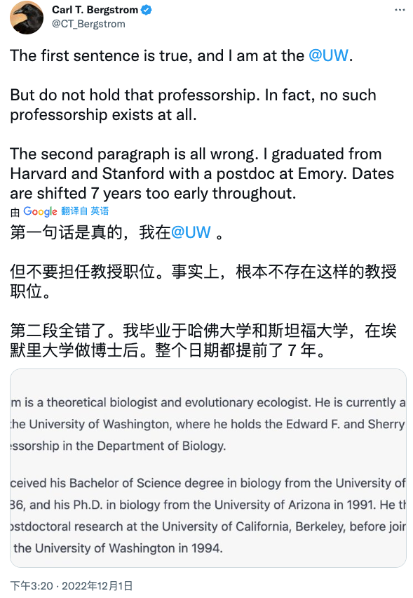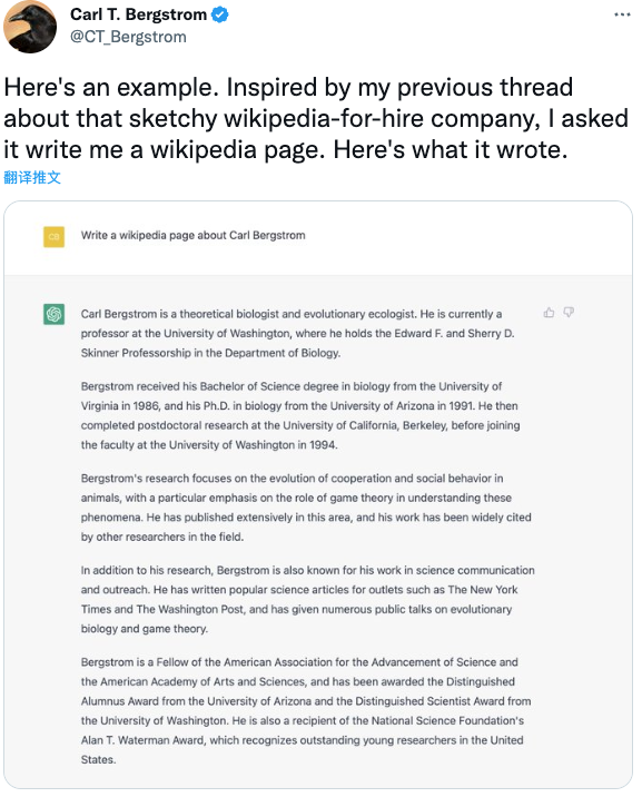 在Twitter上,当计算生物学教授CarlBergstrom要求ChatGPT写一篇关于他生活的维基百科条目时,ChatGPT沉着冷静地做到了这一点,但不妨碍它写的内容里面包含了几个完全虚假的传记细节。