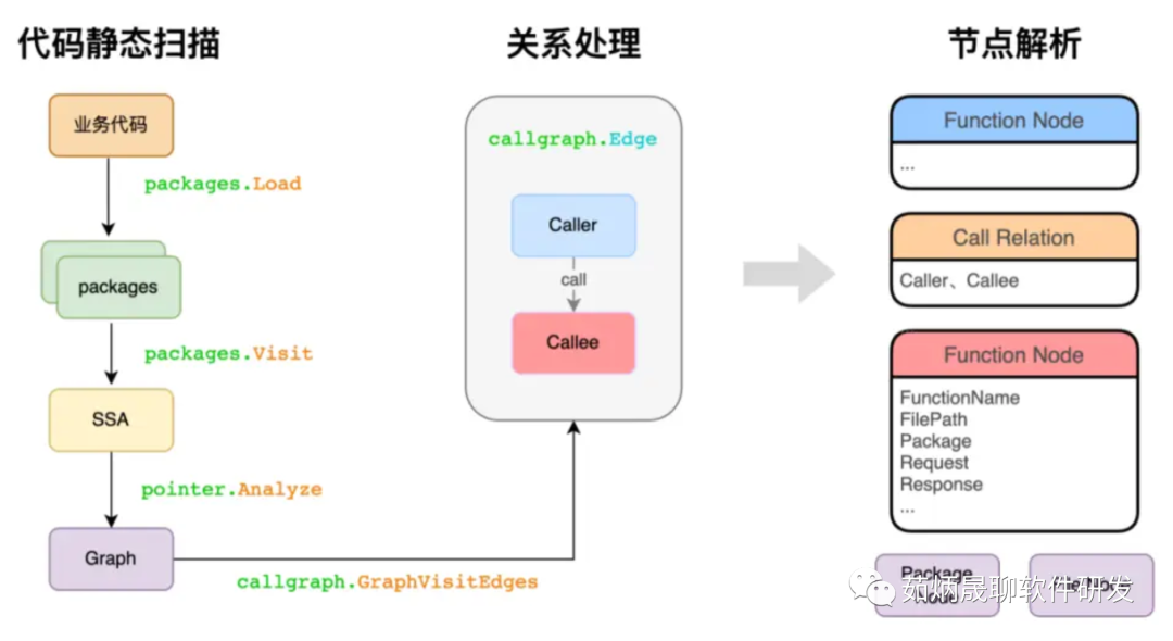 通过调研,我们发现go-callvis能提供基础的函数调用链,但是无法采集函数节点的更多拓展信息。所以我们抽取了go-callvis底层用于采集调用链的 golang.org/x/tools 相关工具包,作为基础调用链的采集工具。