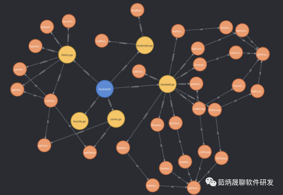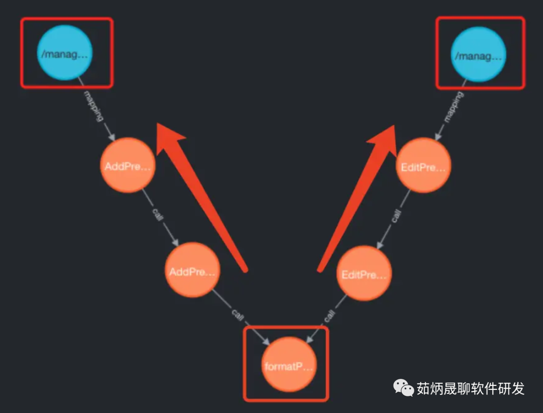 我们将步骤1中采集到的函数信息,直接转成对应的cypher语句,将节点(Node)和关系(relationship) , 分步先后写入Neo4j中,最终得到一张类似于下方的调用链路图。