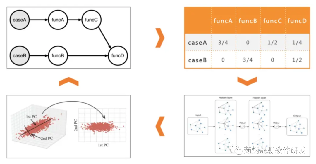通过采集不同case对函数的调用层级,构成一个C × N的稀疏矩阵 (C:测试用例个数,N:函数节点数)