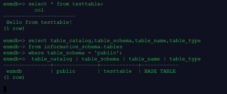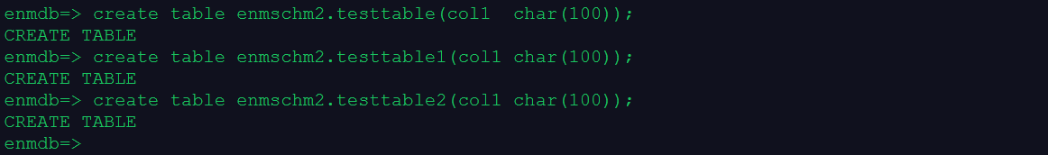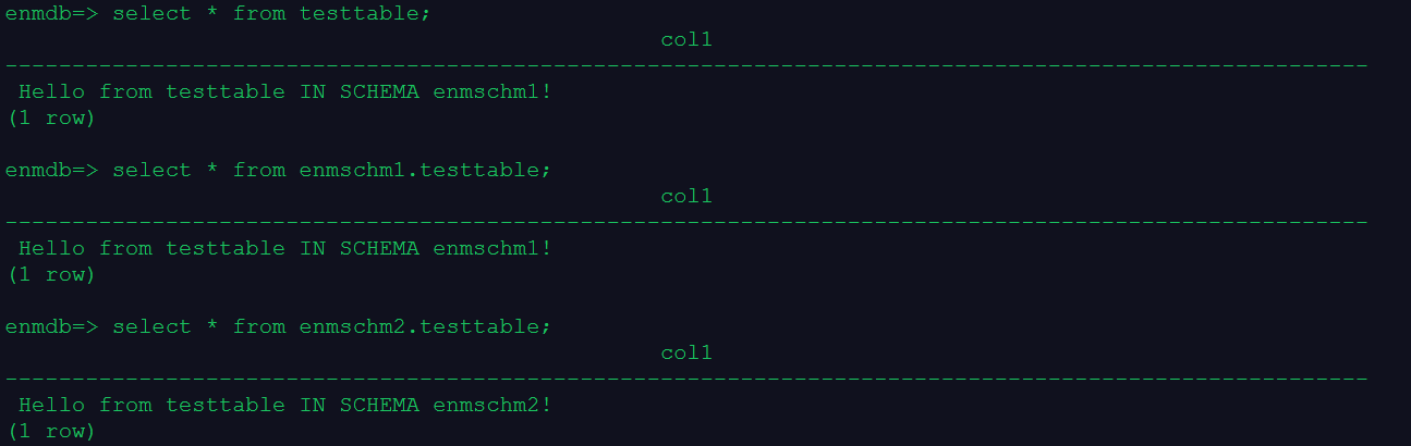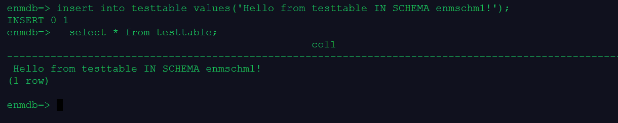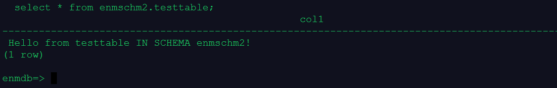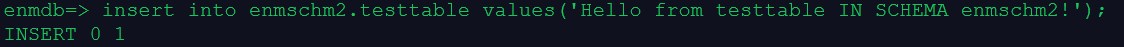 insert into enmschm2.testtable values('Hello from testtable IN SCHEMA enmschm2!');
