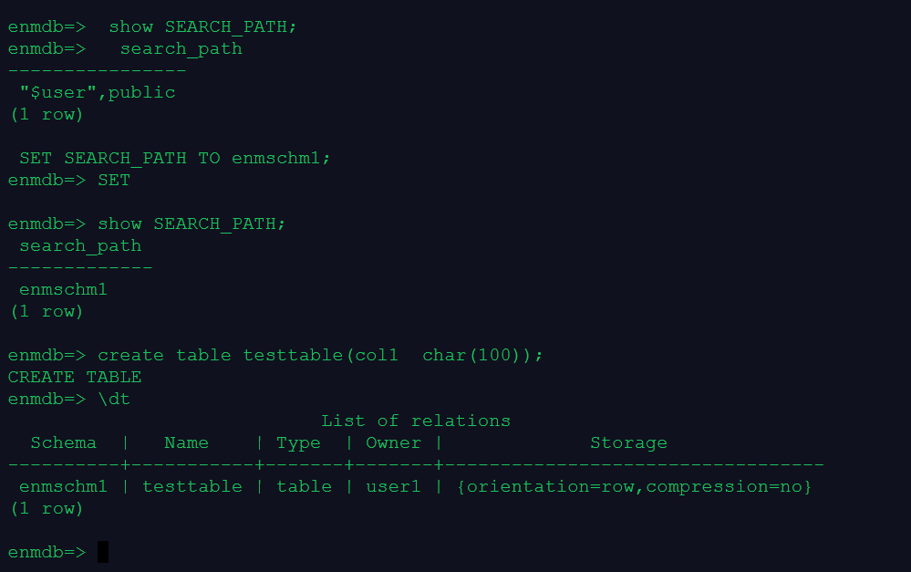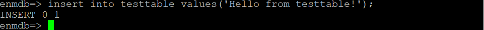 insert into testtable values('Hello from testtable IN SCHEMA enmschm1!');
