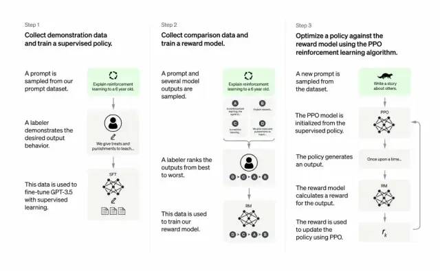 开发人员通过结合监督学习+从人类反馈中获得的强化学习。来提高GPT-3的输出质量。在这种学习中,人类对模型的潜在输出进行排序;强化学习算法则对产生类似于高级输出材料的模型进行奖励。