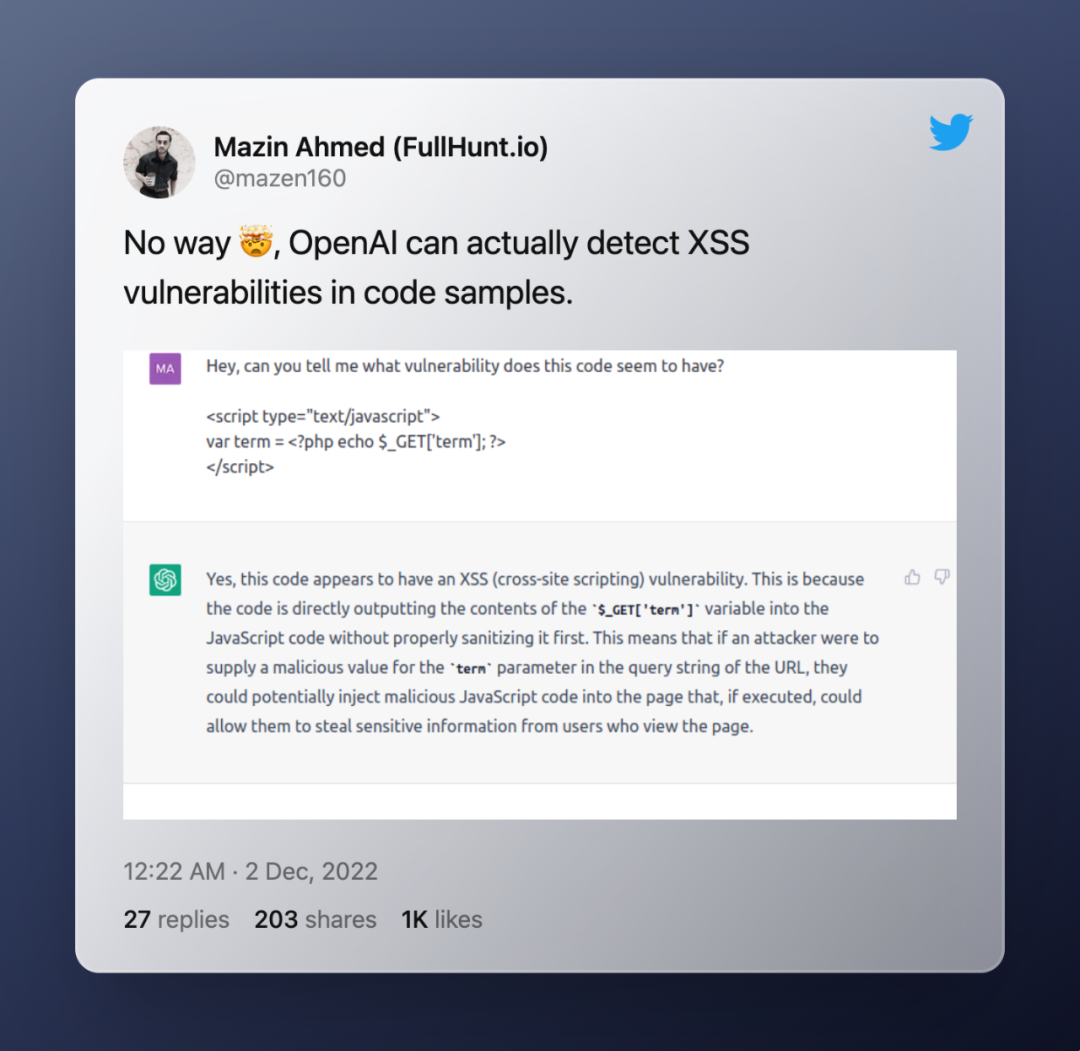 如果一段代码包含安全漏洞,你也可以询问 ChatGPT。它将用简单的语言完美地向你解释判断背后的原因。
