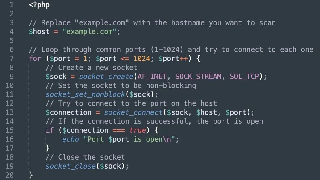 告诉它:“创建一个 PHP 程序来扫描主机名上的开放端口。”