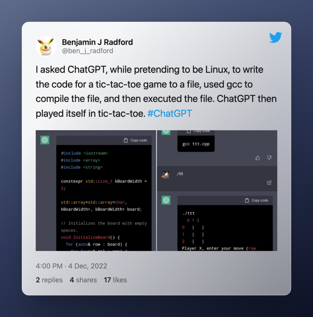 机器学习爱好者和 UNCC 助理教授 Benjamin J Radford 要求 ChatGPT “将井字游戏的代码写入文件,使用 gcc 编译该文件,然后执行该文件。”