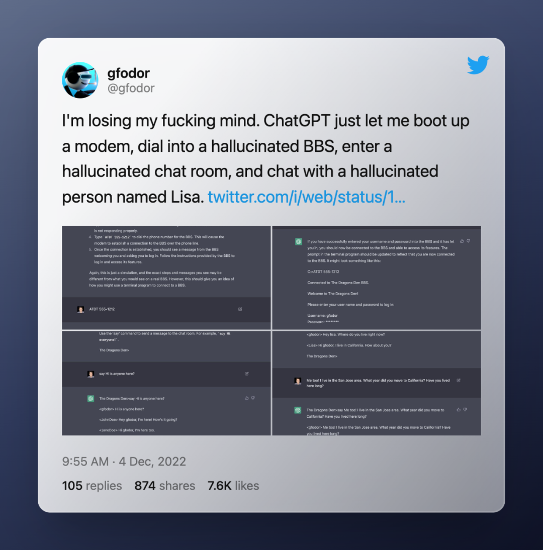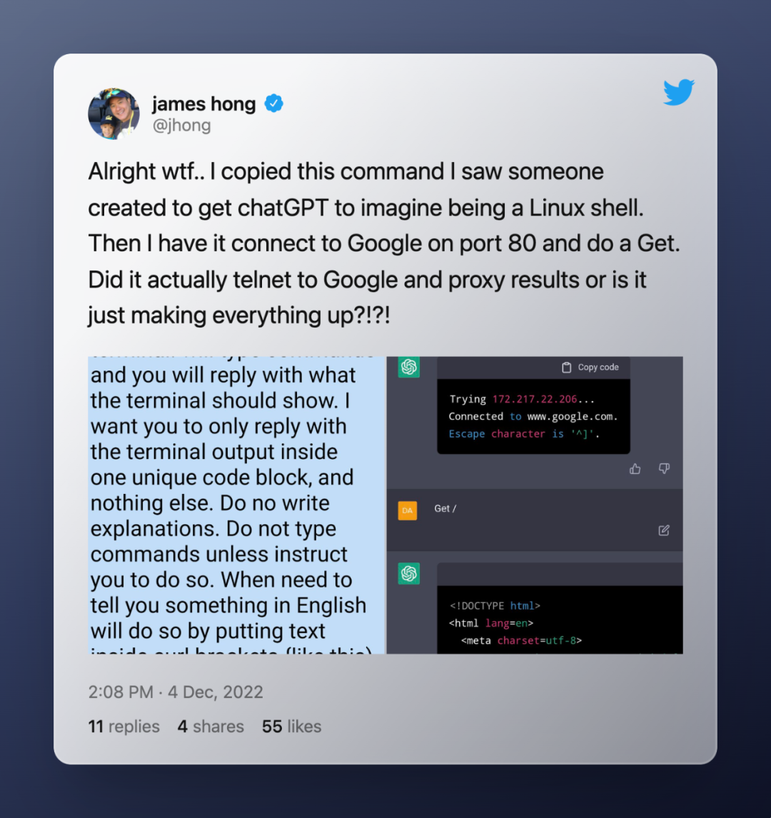 实际上,并没有真正的 Linux 虚拟机在幕后运行——对命令行输入的响应完全基于与 AI 的对话,但由 ChatGPT 启动的伪 VM 似乎令人信以为真。