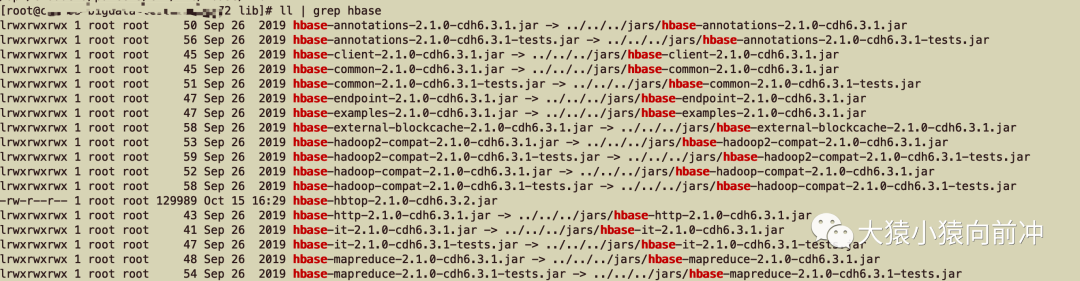 ll | grep hbase & 筛选出来的所有与HBase相关的jar,我们依次对比编译好的HBase安装包中涉及到的jar,从中剔除不需要替换的。