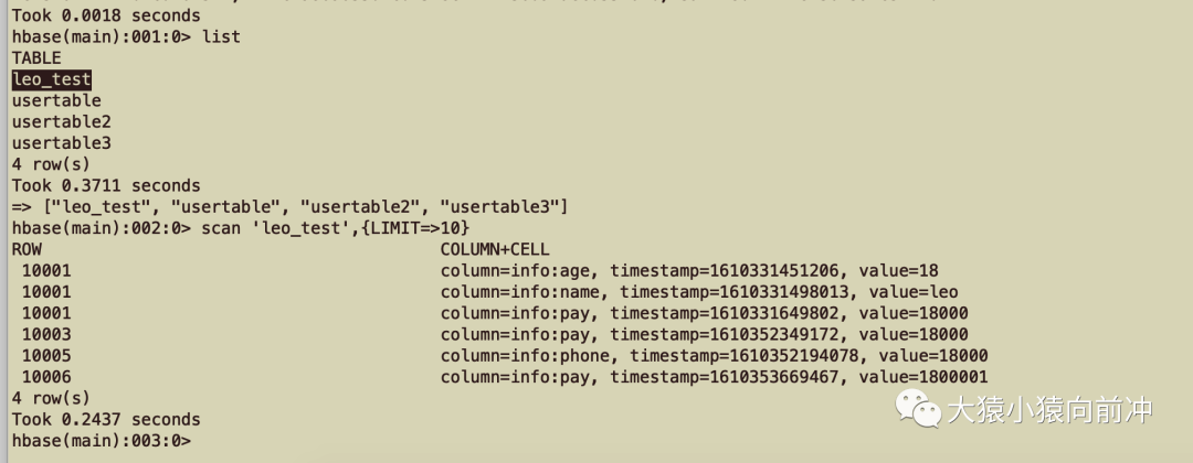 4.3 HBase Shell 进程运行,验证数据读写功能