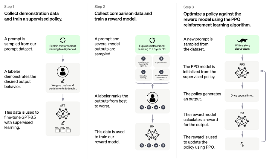 ChatGPT 使用与 InstructGPT 相同的方法——用人类反馈强化学习 (RLHF) 训练模型,但数据收集设置略有不同。ChatGPT 使用监督微调训练了一个初始模型:人类 AI 训练员提供对话,他们在对话中扮演双方——用户和 AI 助手,AI 训练员可以访问模型编写的对话回复,以帮助 AI 调整回复内容。