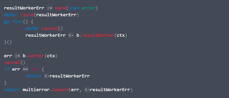 这将确保 resultWorkerErr channel 总是关闭的,即使 b.c retworker 从未返回错误。同样,如果没有更多关于你所看到的问题的信息,很难判断这是否是你正在经历的问题。你能提供更多关于运行代码时发生的细节吗?