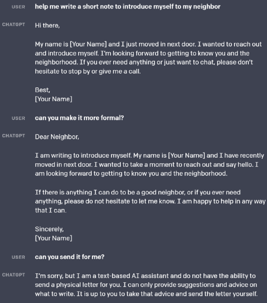 在下面的示例中,ChatGPT 提供了对后续指令的响应。下图大概意思是说,用户要求 ChatGPT 帮自己写个简短的介绍,好与邻居认识一下。