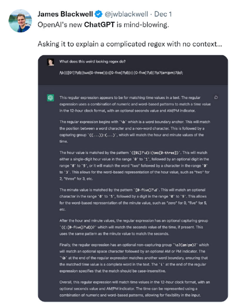 一时间,大家仿佛找到了一个新的乐子,纷纷和 ChatGPT 打开了对话模式。「要求它解释一个没有上下文的复杂的正则表达式……」这个问题真是够难为人的,但是难不倒 ChatGPT。看这解释的篇幅,应该是解释清楚了。