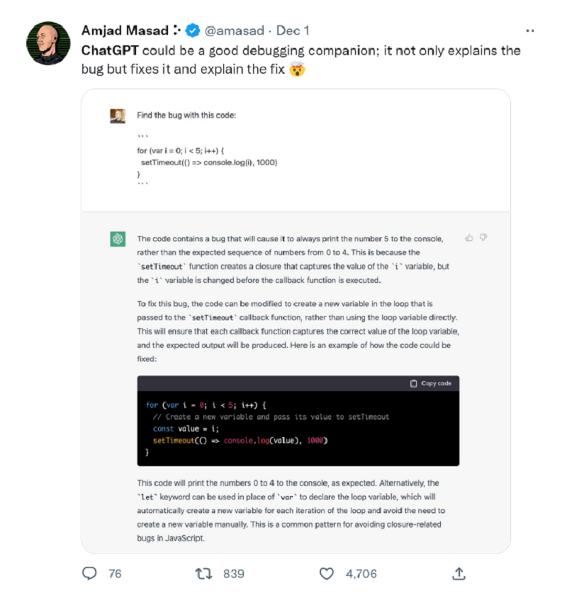 「ChatGPT 是一个很好的 debugging 伙伴,它不仅能解释 bug,还能修复 bug 并解释修复 bug 的方法。」网友表示。
