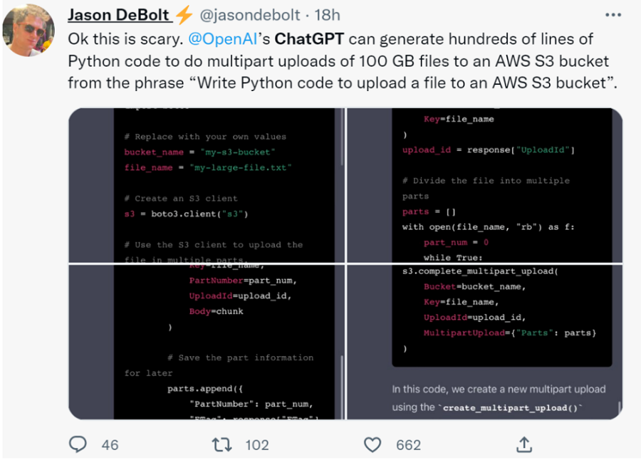 「ChatGPT 可以生成数百行 Python 代码,将 100 GB 的文件上传到 AWS S3 bucket 中,只需编写这样一句话即可「Write Python code to upload a file to an AWS S3 bucket(编写 Python 代码,将文件上传到 AWS S3 bucket 中)。」