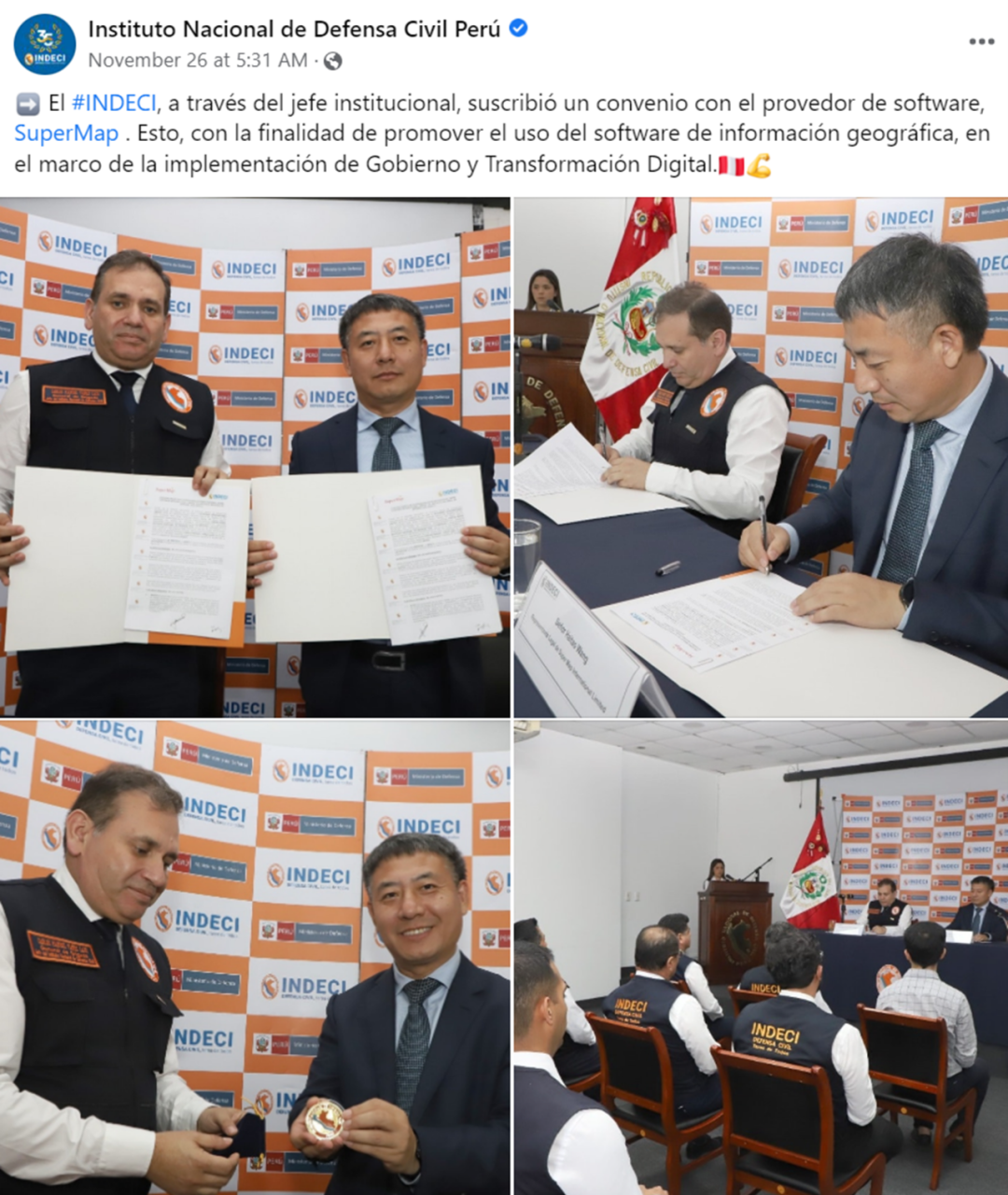 11月25日,超图与秘鲁国家民防研究所(西班牙语:Instituto Nacional de Defensa Civil,简称INDECI)签约,入围INDECI平台采购供应商体系。INDECI隶属于秘鲁国防部,是秘鲁国家灾害风险管理系统的成员单位。双方的签约,也拉开了超图和秘鲁国防部合作的序幕,超图正式成为其GIS平台软件供应商。
