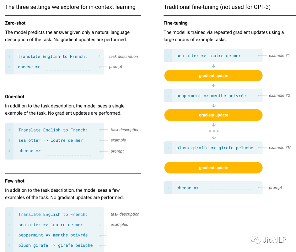 GPT-3 就开始颠覆这种认知了。它提出了一种 in-context 学习方式。这个词没法翻译成中文,下面举一个例子进行解释。
