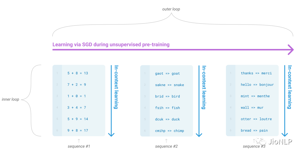 在 GPT-3 的预训练阶段,也是按照这样多个任务同时学习的。比如“做数学加法,改错,翻译”同时进行。这其实就类似前段时间比较火的 prompt。