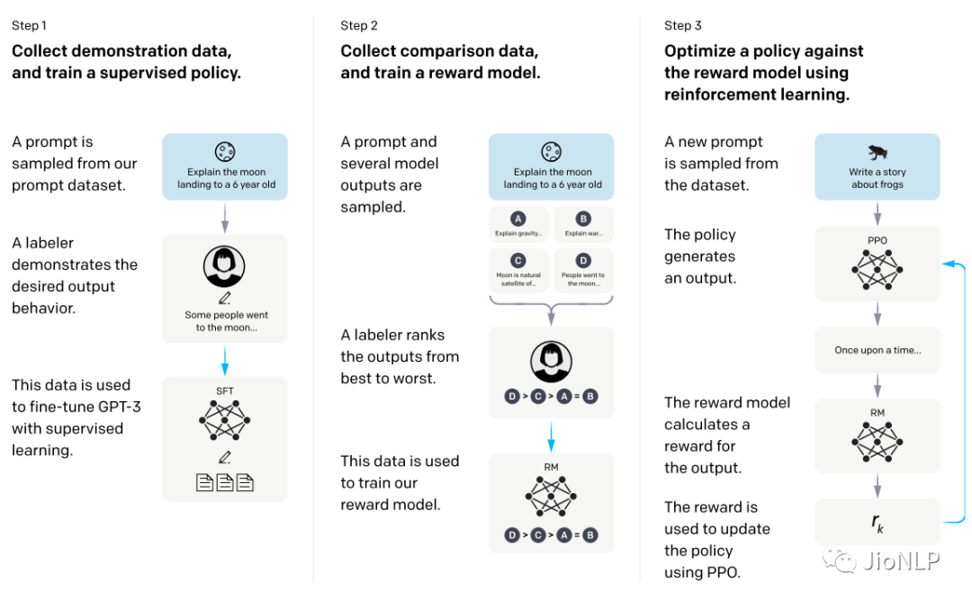 这里重点是第二部中,如何构建一个 reward 函数,具体就是让那40名外包人员不断地从模型的输出结果中筛选,哪些是好的,哪些是低质量的,这样就可以训练得到一个 reward 模型。