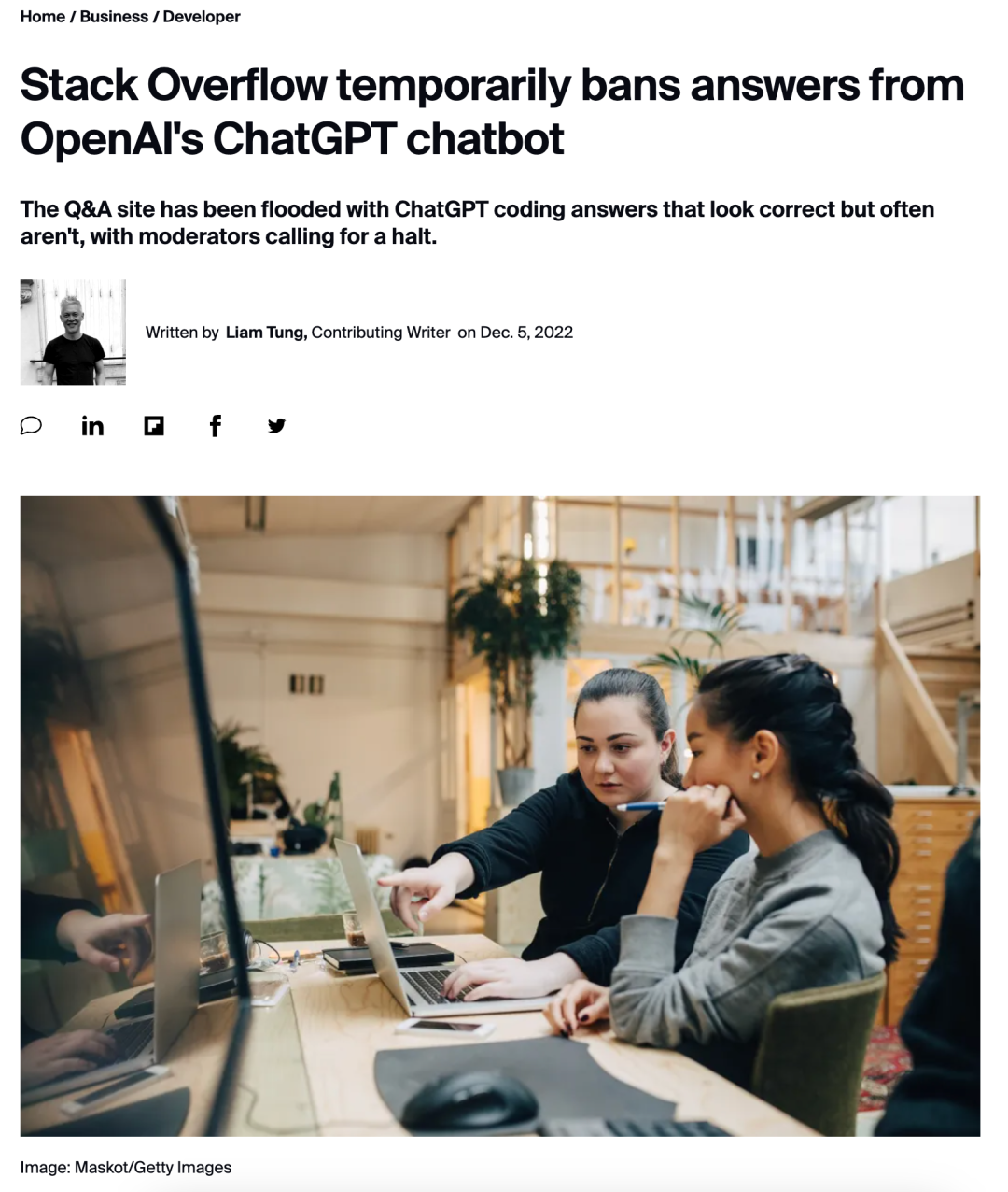 我对火爆的ChatGPT怎么看?说实话,作为AI/CS从业者,我特别担忧。瞧,这几天,Stack Overflow不是忙着讨论禁止用ChatGPT回答问题吗(技术上能否禁止要另说)?我也严肃地把我对ChatGPT的个人意见简单列在下面: