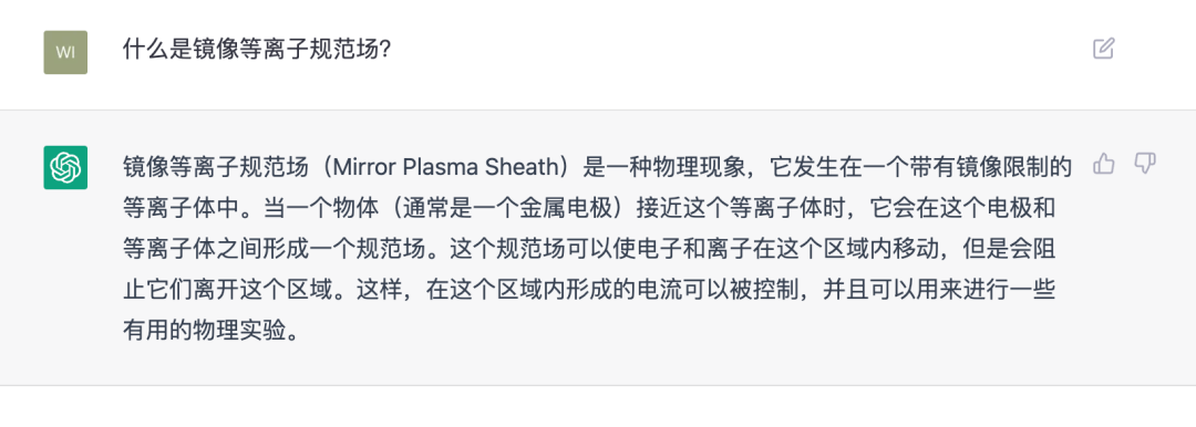 例如,以下是我用杜撰的学术概念“镜像等离子规范场”“自然语言里的丁达尔现象”向ChatGPT提问的情形。看得出,AI确实在不懂装懂地卖弄“学识”: