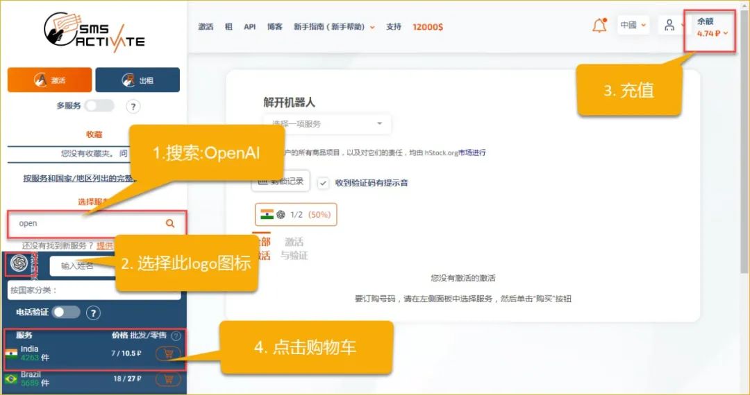 打开链接 https://sms-activate.org/cn,这里注意代理的话开全局,否则不成功。操作详细过程如图,目前最便宜的是 India,我用支付宝充值了1.68元,购买成功后还有一点点剩余。第一次10分钟还没没有收到验证码,可免费取消再购买,不用再额外花钱的,第二次很快收到验证码。