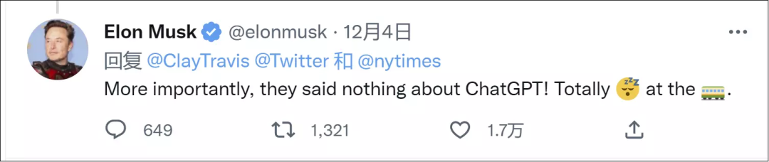 可以看出马斯克本人对于ChatGPT报以极大的重视,这么一位科技巨子多关注的东西定然不是寻常物。而且耐人寻味的是,马斯克曾是ChatGPT背后公司openAI的老板。